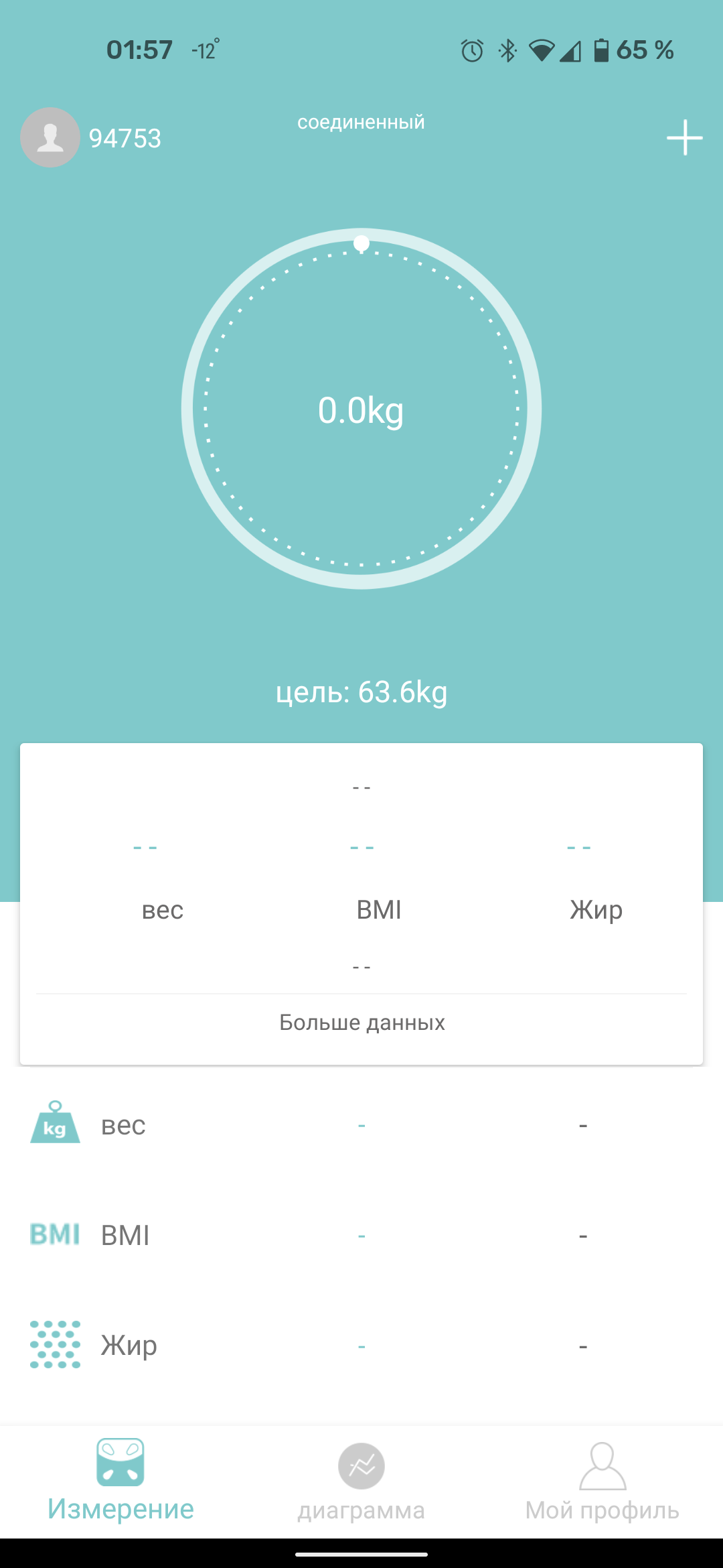 Перед первым измерением на главной странице приложения высвечиваются незаполненные графы для веса, индекса массы тела и процентов жира.