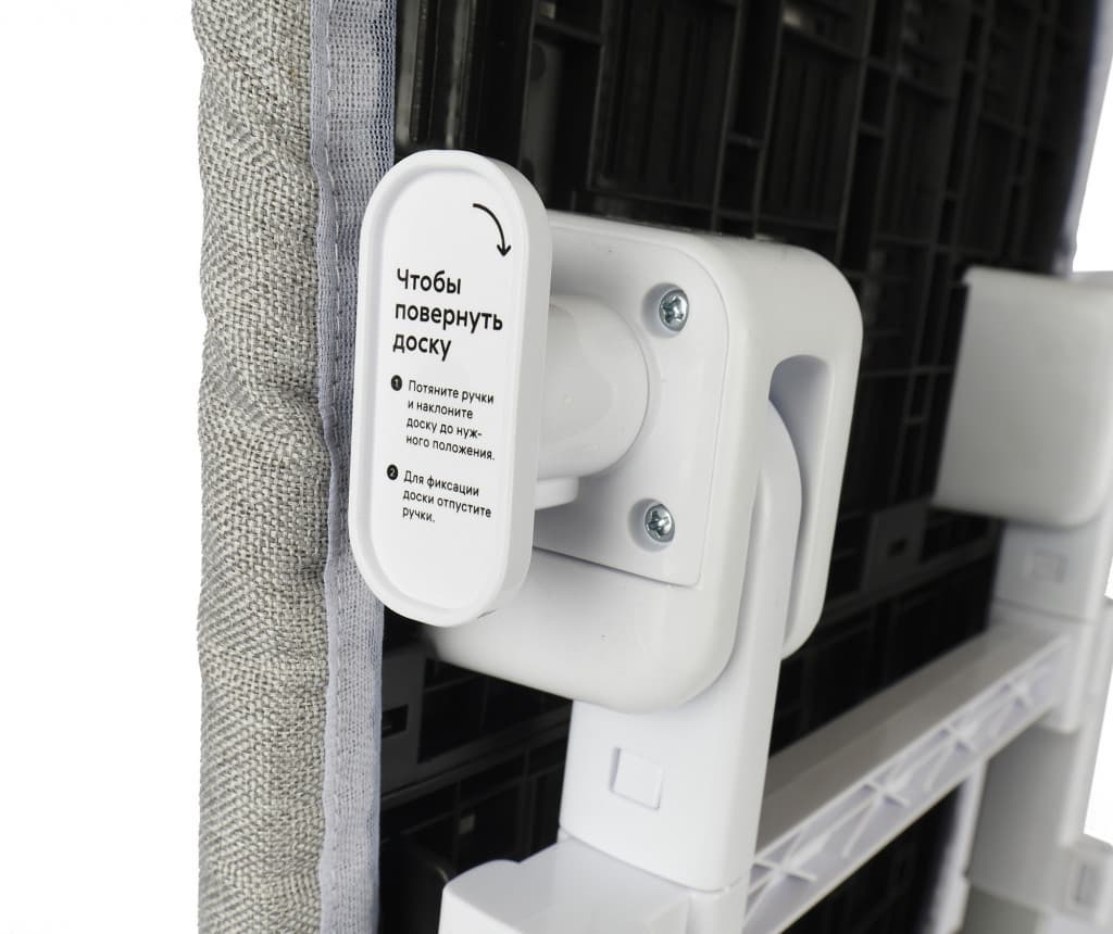 Он очень комфортно, интуитивно собирается. Каждое крепление надежно, легко устанавливается. Положения гладильной доски (их три: горизонтальное, вертикальное и под углом) просто меняются. Для удобства на специальных рычажках с двух сторон оставлены надписи на русском языке: «Чтобы повернуть доску…». Оттяните рычажки и выберите нужное положение, затем отпустите рычажки на место.