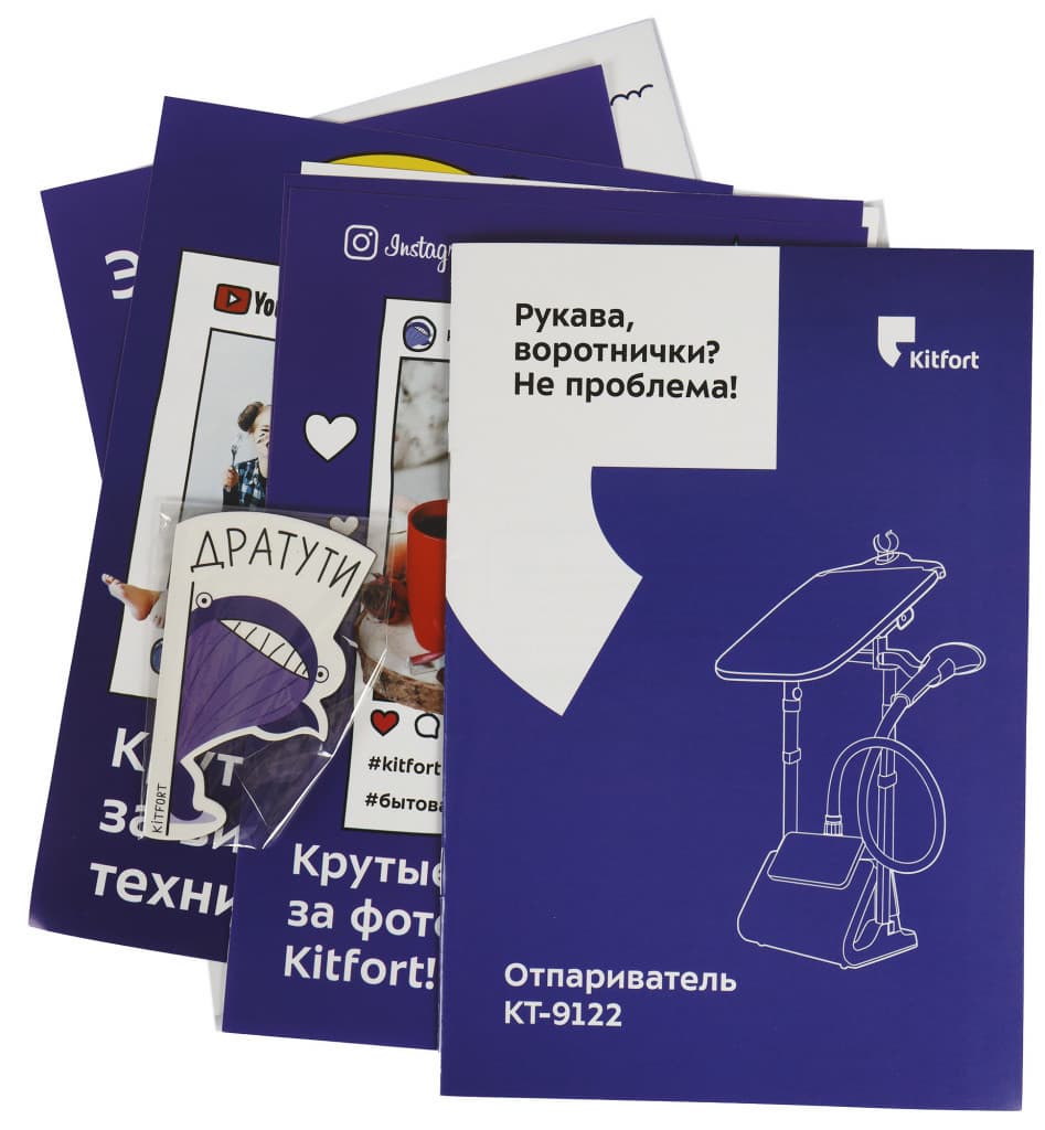 Инструкция оформлена в традиционных для бренда цветах. На обложке новый лукавый слоган «Рукава, воротнички? Не проблема!» и название модели. Глянцевая бумага, формат А5, 20 страниц. Внутри контакты бренда, оглавление, общие сведения, комплектование, наглядная схема устройства, рекомендации по сборке, использованию и уходу. Отдельными разделами выделены технические характеристики, особенности устранения неполадок. Приведены меры предосторожности, на последней странице рекламные материалы.