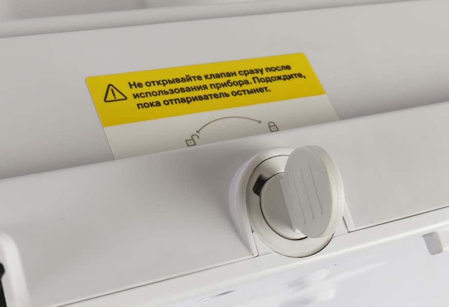 До начала работы вы снимаете резервуар с отпаривателя, переворачиваете, откручиваете крышку-клапан, заливаете воду, закручиваете крышку и ставите резервуар на место. Именно ставите, не вкручиваете, не встраиваете. Одно легкое движение — опускаете и аппарат готов к работе.