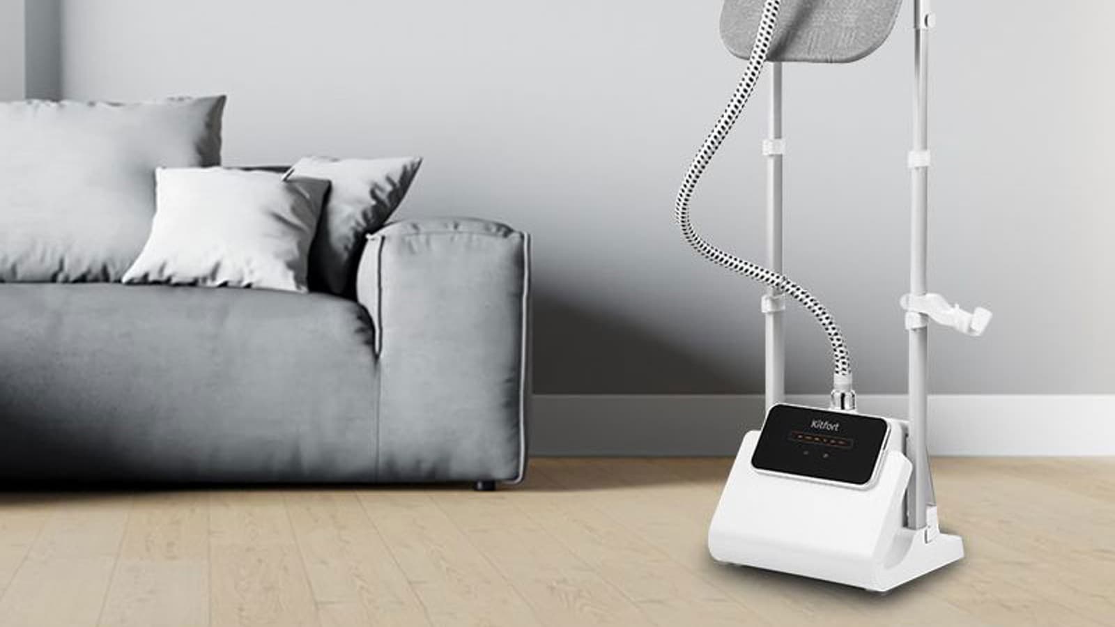Kitfort КТ-9122 очень элегантен. После сборки весьма компактен для напольного отпаривателя. Сочетание белого цвета пластиковых деталей, серебра стоек из легкого металла и серой тканевой обшивки гладильной доски, плюс черная панель управления, делают его даже красивым. Он отлично вписывается в любой интерьер, не занимает много пространства и может использоваться как отдельная вешалка для подготовленной на выход одежды. Весьма удобно, если отпарил детский школьный костюм и оставил на видном месте.