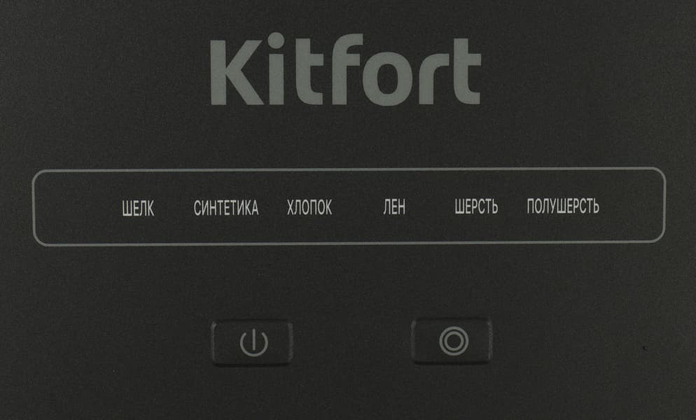 У Kitfort КТ-9122 сенсорная панель управления. Кнопка «вкл./выкл.» отвечает за запуск и окончание работы. Вторая кнопка переключает уровни подачи пара. Их шесть: шелк, синтетика, хлопок, лен, шерсть и полушерсть. Определения условны, здесь «шелк» соответствует самой деликатной и минимальной подаче, «полушерсть» — максимальной. По сути, чем плотнее или толще ткань, тем больше пара потребуется для очистки и разглаживания. При каждом нажатии на кнопку меняется уровень, под его названием загорается индикатор. Нажатия сопровождаются негромким и коротким звуковым сигналом.