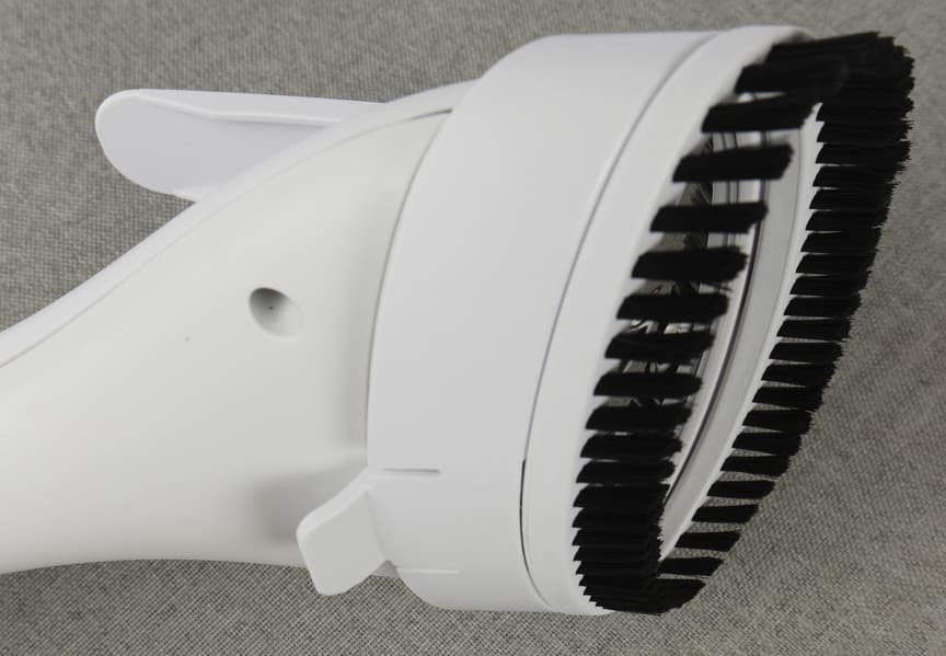 У этой модели очень широкий утюжок — 13,5 см. Место для подачи пара оформлено девятью отверстиями и выполнено из металлической пластины. Потому он отлично работает и как паровой утюг, и собственно отпариватель. В комплекте с ним идет очень удобная щетка с держателем. Ее легко устанавливать, она надежно фиксируется и имеет приятный бонус. Зажим на ней помогает закрепить ткань для создания, например, красивых стрелок на брюках.
