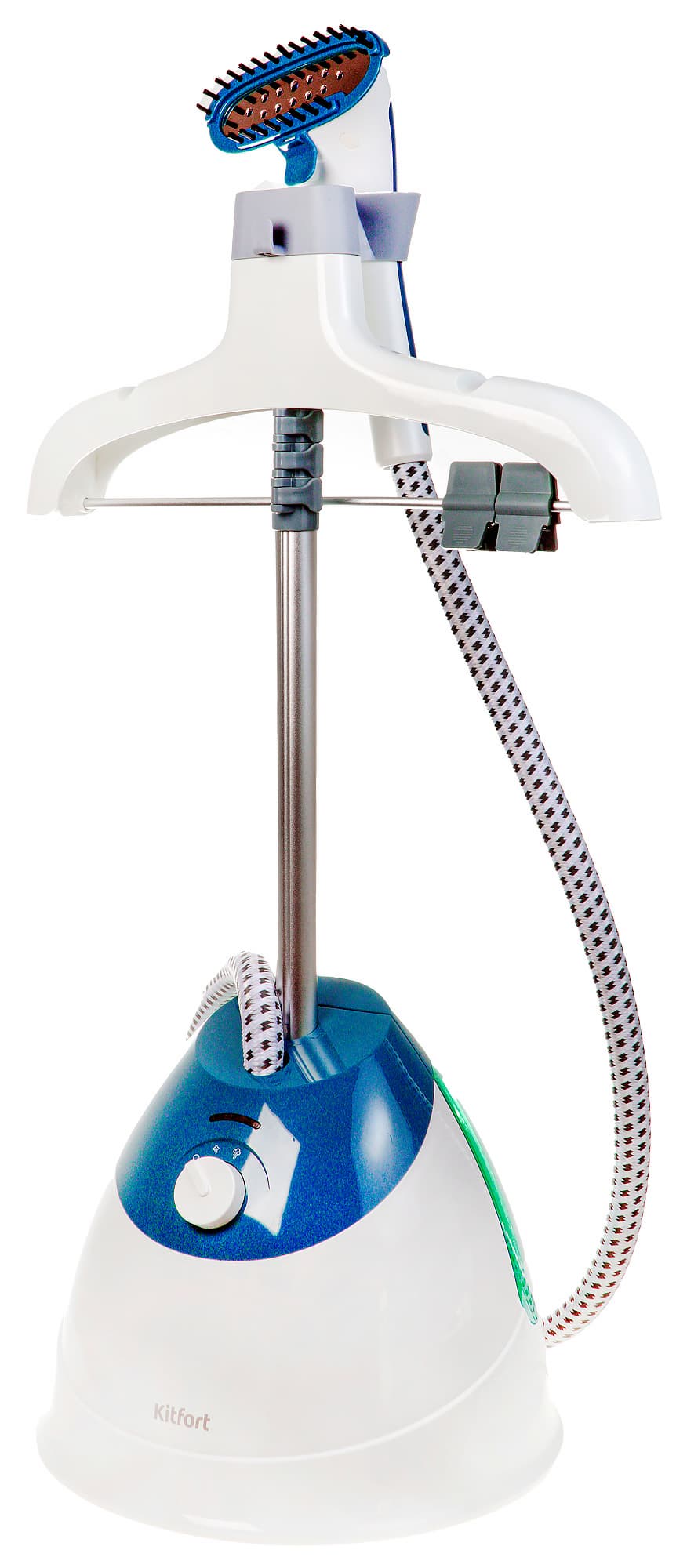 Внешне отпариватель Kitfort KT-967 представляет собой корпус с емкостью для воды и стойку, на которой закреплена вешалка с держателем для парового утюжка. К корпусу присоединен шнур электропитания и паровой шланг с утюжком на его конце.