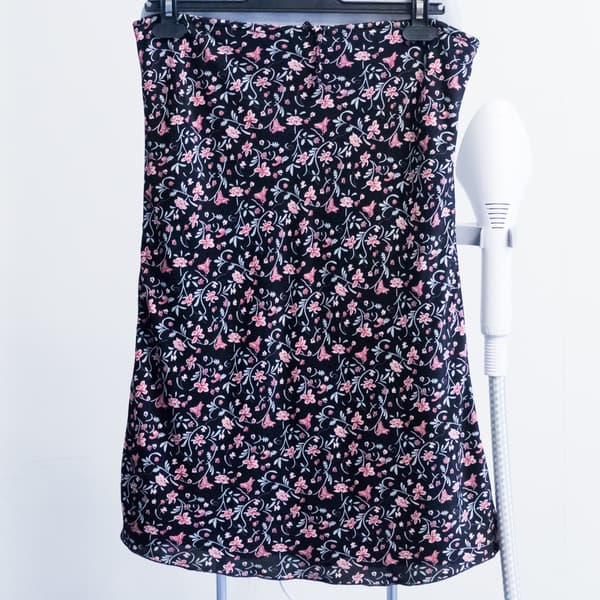 Юбка изготовлена из полотна скорее легкого, смешанного из синтетики и хлопка. Мнется не сильно. Конструктивно вещь тоже простая, однако трудность при уходе за ней состоит в том, что у юбки есть подкладка. В этом случае погладить с помощью вертикального отпаривателя бывает легче, чем классическим способом.