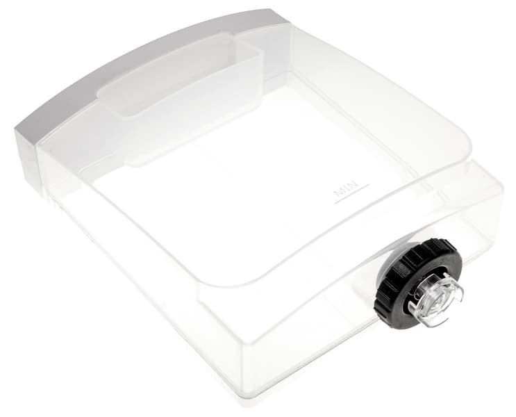 Сама емкость для воды изготовлена из прозрачного пластика. Объем ее невелик, но учитывая, что воду нужно сливать после каждого использования, представляется нам более чем достаточным. Наверху передней стенки имеется выемка для удобства манипуляций с резервуаром. В нижней части нанесена отметка о минимальном объеме воды.