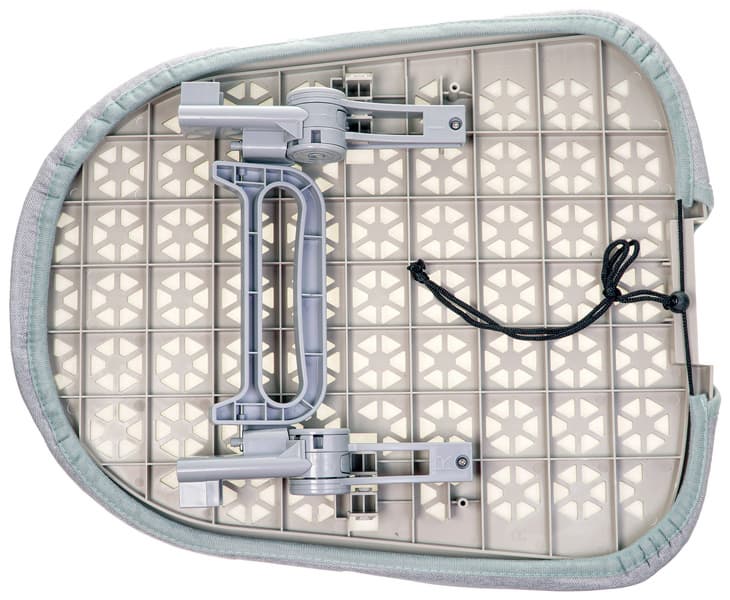 Гладильная доска представляет собой относительно небольшую плоскость размерами по наиболее выступающим частям 49×39,5 см. Основание изготовлено из пластика, в поверхности выделено много отверстий в форме шестиугольника. Чехол съемный, сделан из прочной ткани, с внутренней стороны проложенной тонким слоем поролона.