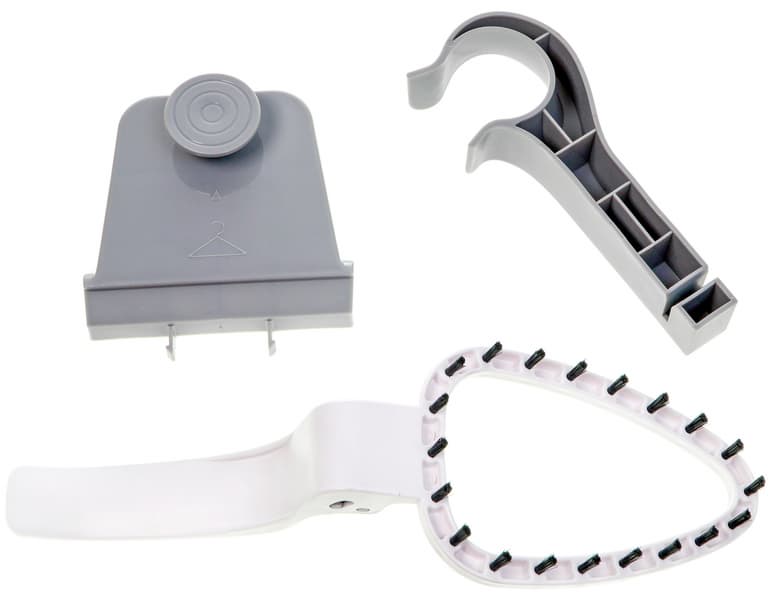 Длинная ручка ворсовой щетки оснащена пружиной. Благодаря этому щетка может как плотно прилегать к подошве, так и отходить от нее на несколько сантиметров. Закрепляется насадка довольно тяжело — металлическая деталь на утюжке вставляется в отверстие на щетке туго. При правильной установке раздается легкий щелчок.