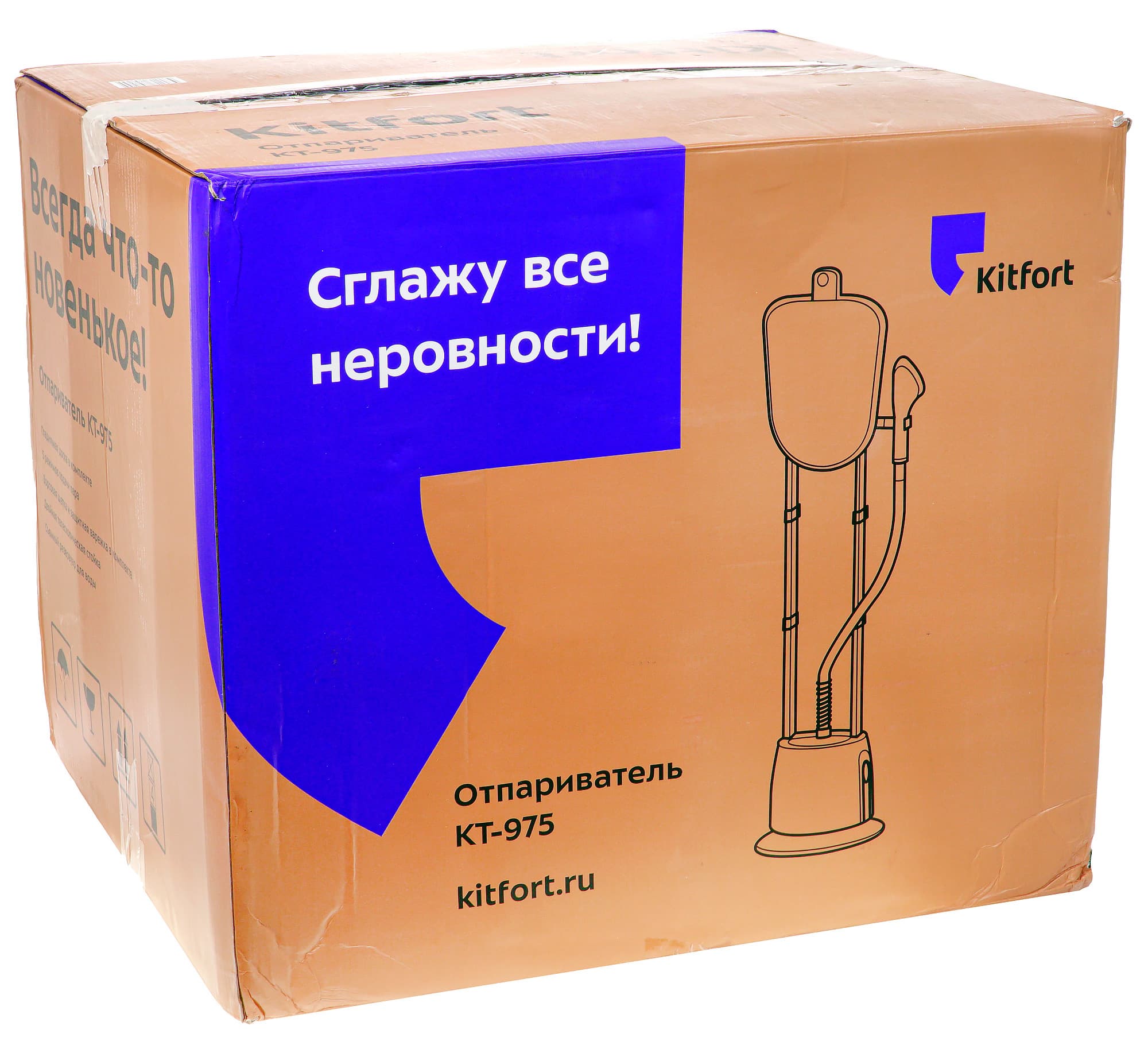 Вертикальный отпариватель Kitfort KT-975 поставляется в коробке, изготовленной из плотного картона. Коробка довольно объемная, так что унести ее под мышкой будет проблематично. Изучив информацию, представленную на ее сторонах, можно ознакомиться с внешним видом устройства и его техническими характеристиками. Вскрыв упаковку, внутри мы обнаружили: