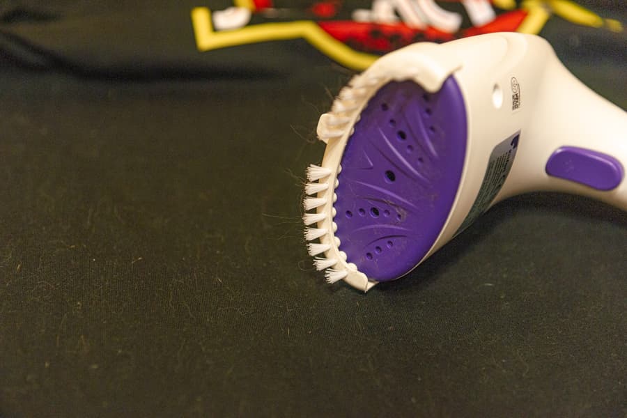 Все-таки щетина оказалась слишком мягкой. В итоге после отпаривания мы убрали оставшийся мусор с ткани обычным липким роликом.