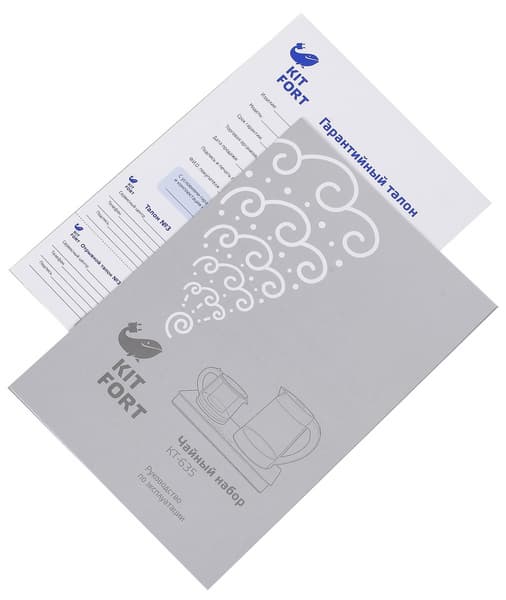 Чайник поставляется в самой обычной картонной коробке, оформленной в фирменной стилистике Kitfort — однотонный фон, векторное изображение прибора, логотип компании, основные технические характеристики и т. п.