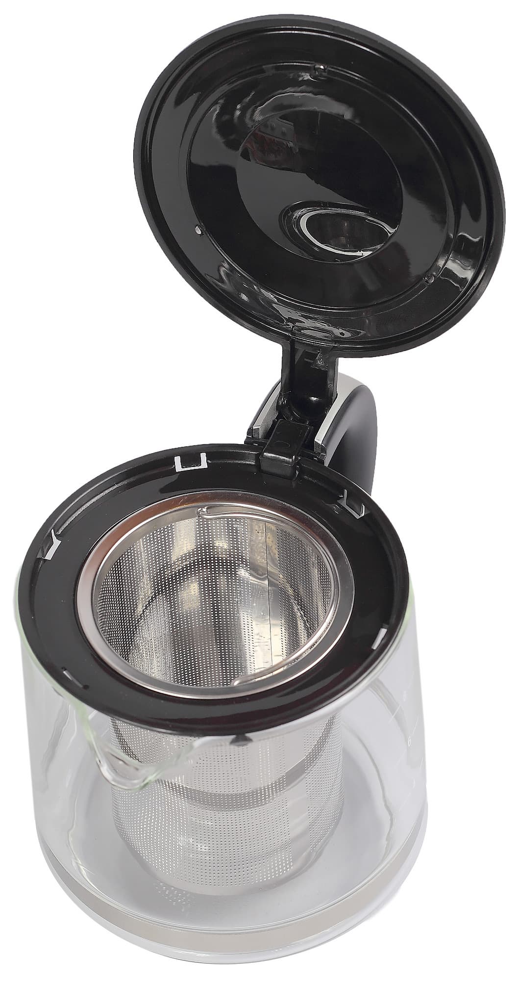 Крышка у кувшина сделана из пластика и металла. Открывается она с помощью специального рычажка. Внутри кувшина находится металлическая заварочная колба с множеством мелких отверстий, оснащенная миниатюрной металлической ручкой-проволочкой. Такую колбу можно наполнить заваркой и установить в чайник, либо извлечь в любой момент.