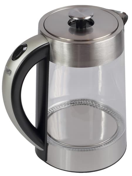 Основные материалы, из которых сделан чайник — это пластик, стекло и нержавеющая сталь. Дно и ручка у чайника пластиковые, верх и низ корпуса оформлен металлическими пластинами. Крышка также имеет как пластиковые, так и металлические элементы.