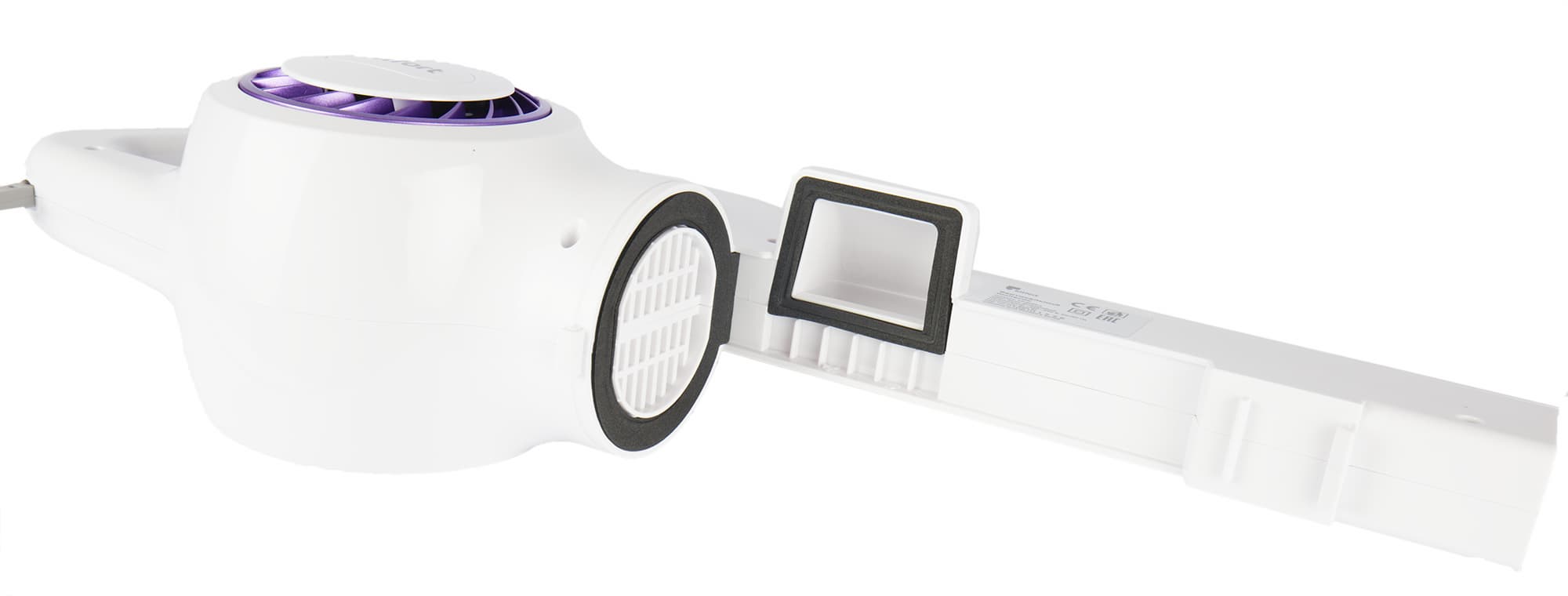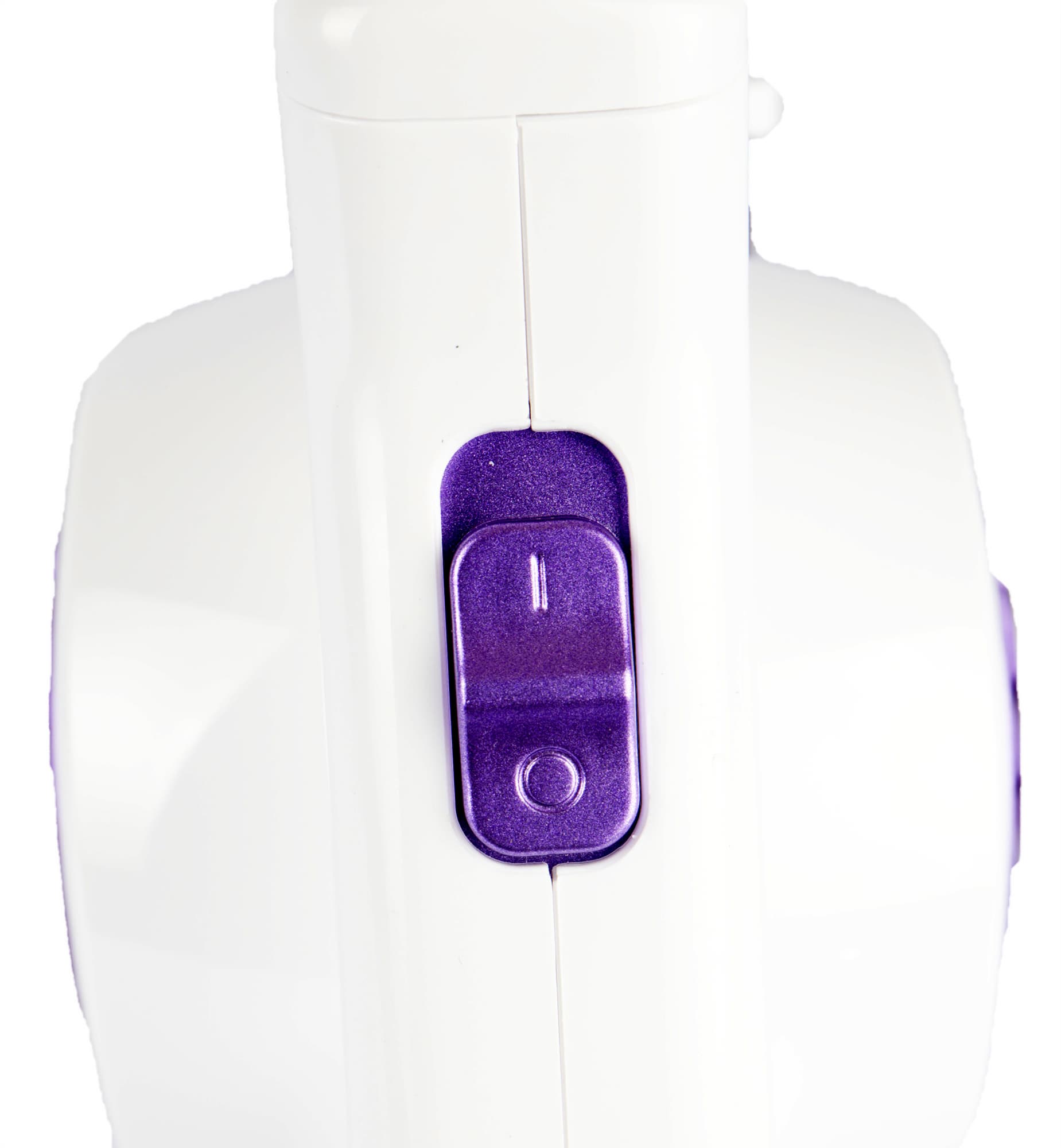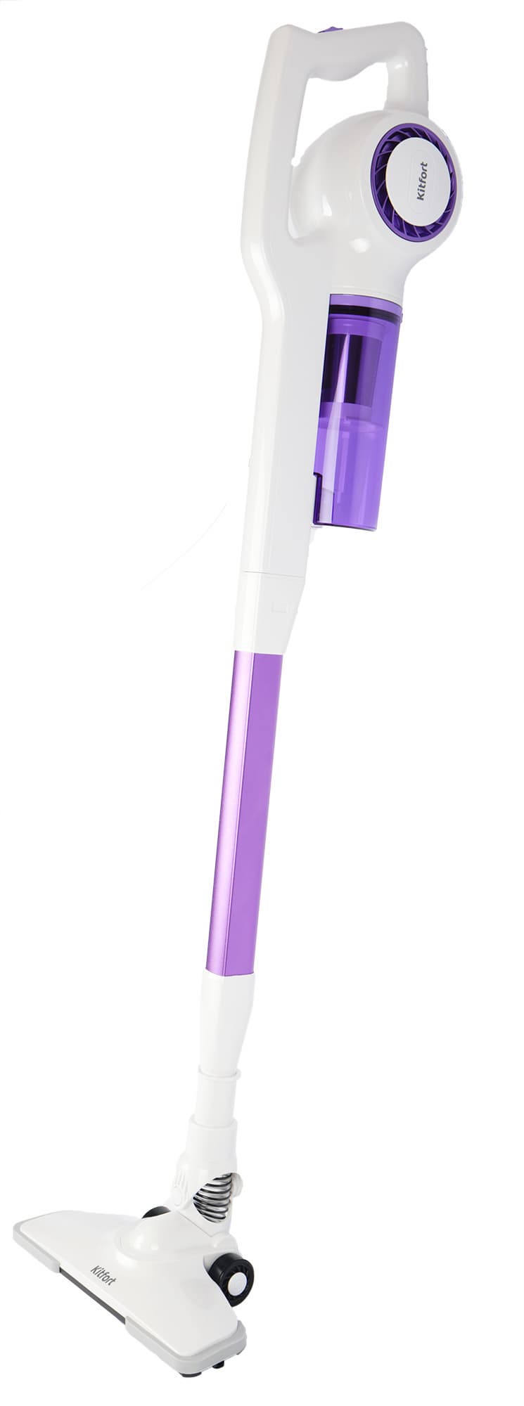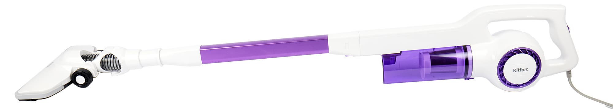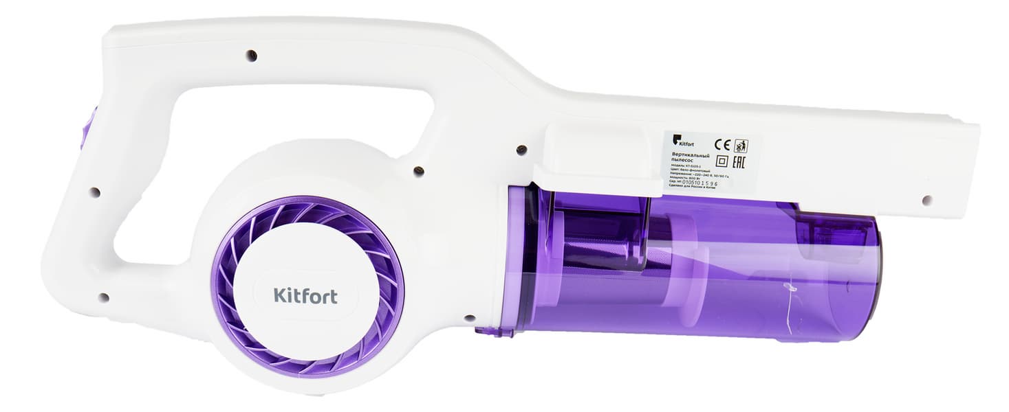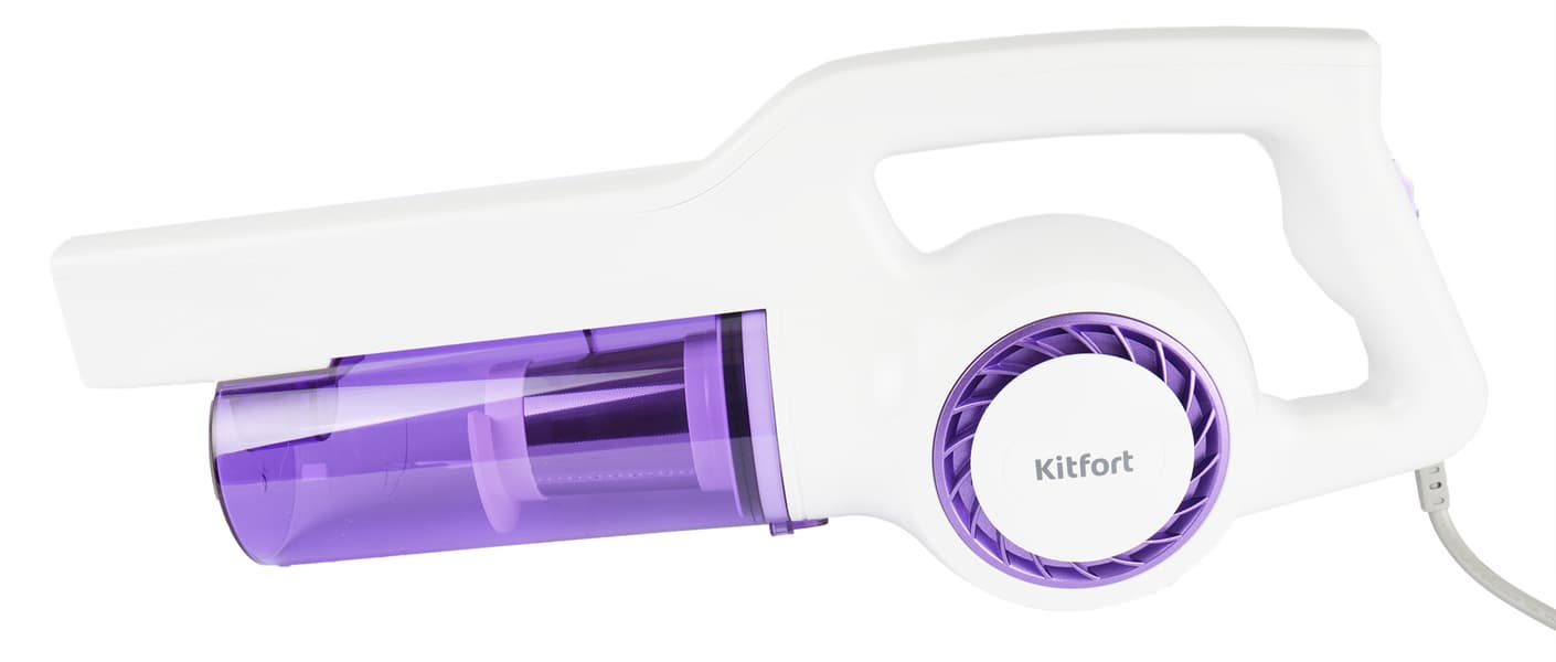 Сразу обращает на себя внимание фирменная цветовая гамма Kitfort: основные детали корпуса белые, декоративные элементы и пластик пылесборника фиолетовые.