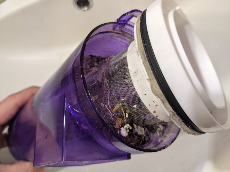 Поток воздуха попадает в контейнер под углом и закручивается вокруг несложного циклонного фильтра. Тяжелый и крупный мусор оседает в нижней части емкости, а мелкая пыль и мусор остаются на стальной сетке.