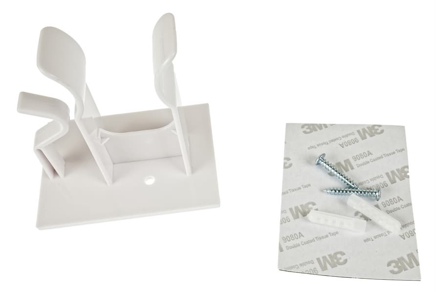 В это же время производитель рекомендует позаботиться о размещении настенного крепления. Его можно либо привинтить с помощью прилагаемых саморезов с нейлоновыми дюбелями, либо, если нет желания дырявить стену, приклеить на двусторонний скотч (в комплекте). В последнем случае поверхность стены рекомендуется очистить и обезжирить.