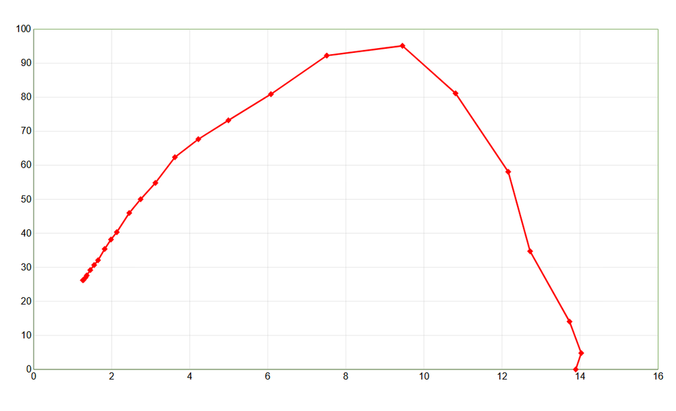 Мощность всасывания (что это такое и как мы ее измеряем, описано в отдельной статье) мы определяли при работе пылесоса без насадок. Зависимость мощности всасывания от создаваемого разрежения приведена на графике ниже: