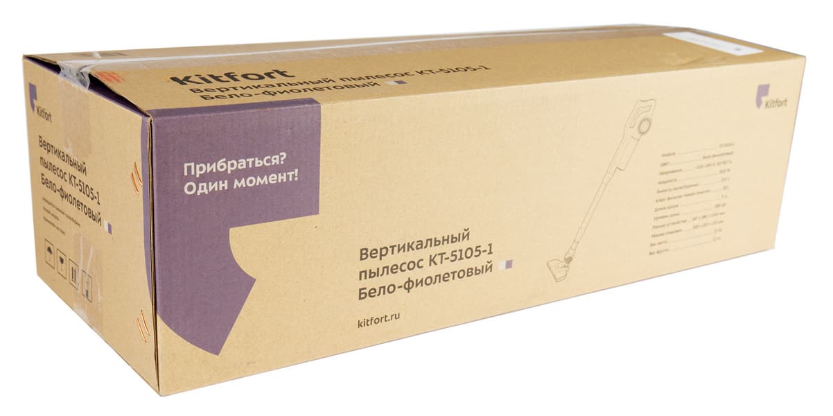 Прибор упакован в коробку из коричневого картона. На ее лицевой стороне, помимо изображения устройства и названия модели, есть технические характеристики и, как это принято у Kitfort, привлекательный слоган, свой для каждого класса бытовых приборов этого производителя. Для вертикальных пылесосов маркетологи компании выбрали девиз «Прибраться? Один момент!».