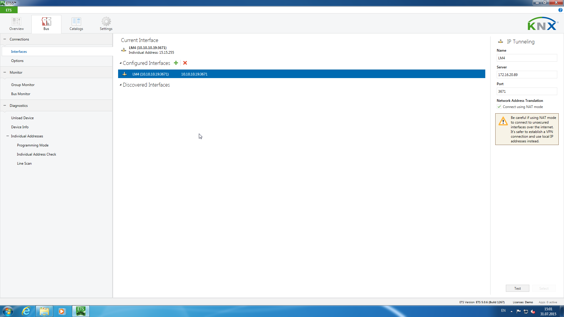 Теперь настало время для загрузки проекта в систему автоматизации. Для этого нужно вернуться на стартовый экран ETS и на закладке Bus настроить интерфейс, через который будет осуществляться работа с шиной. В нашем случае это мост в IP, реализованный через LogicMachine4.