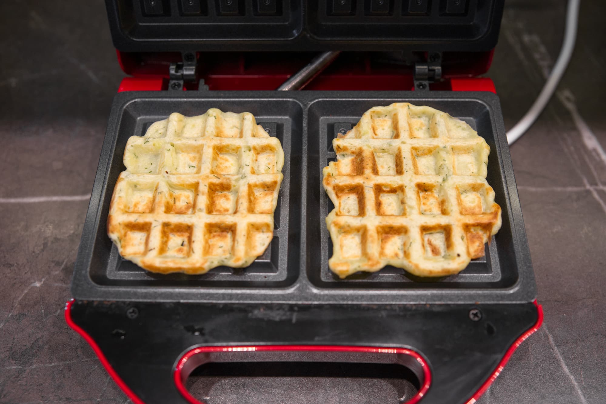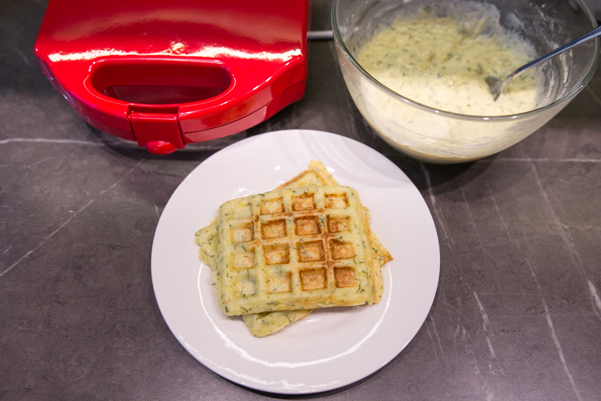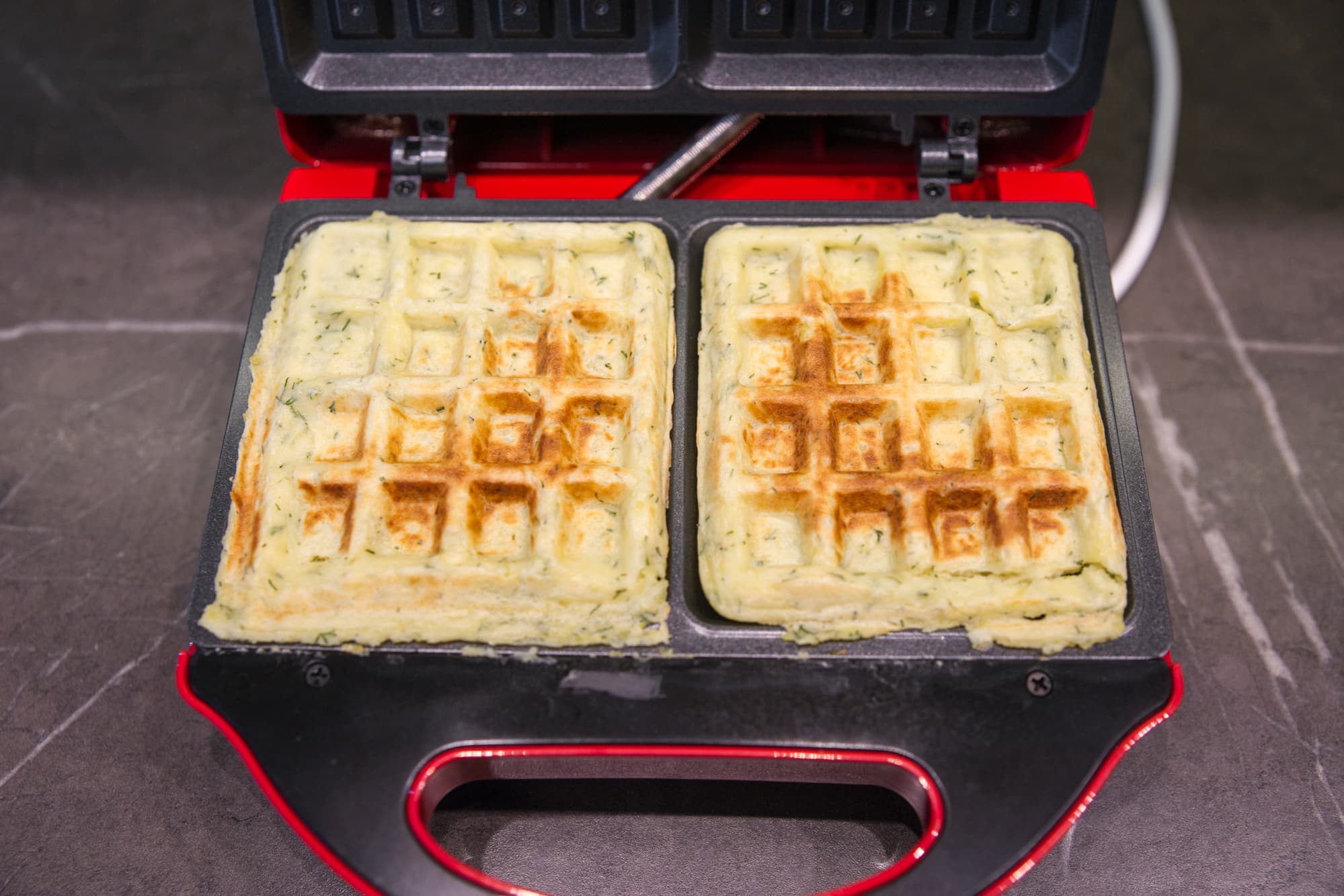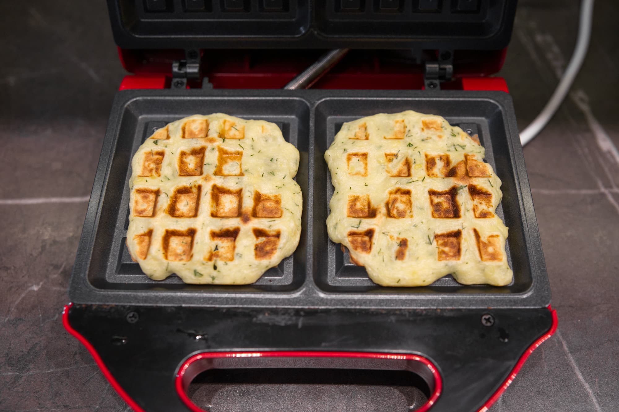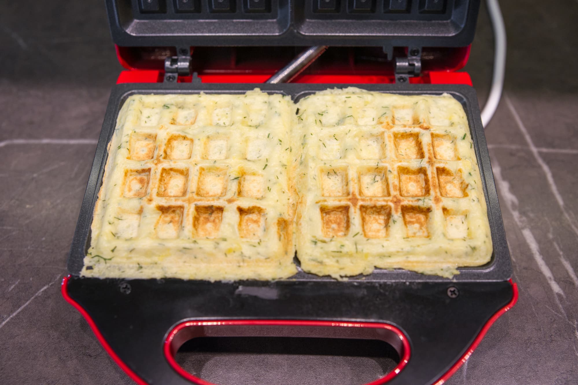 Заранее подготовленное картофельное пюре с молоком и сливочным маслом смешали с просеянной мукой, измельченным укропом, солью и парой яиц. Разогрели вафельницу в закрытом виде, выложили картофельную массу на панели, разровняли ложкой и закрыли вафельницу.