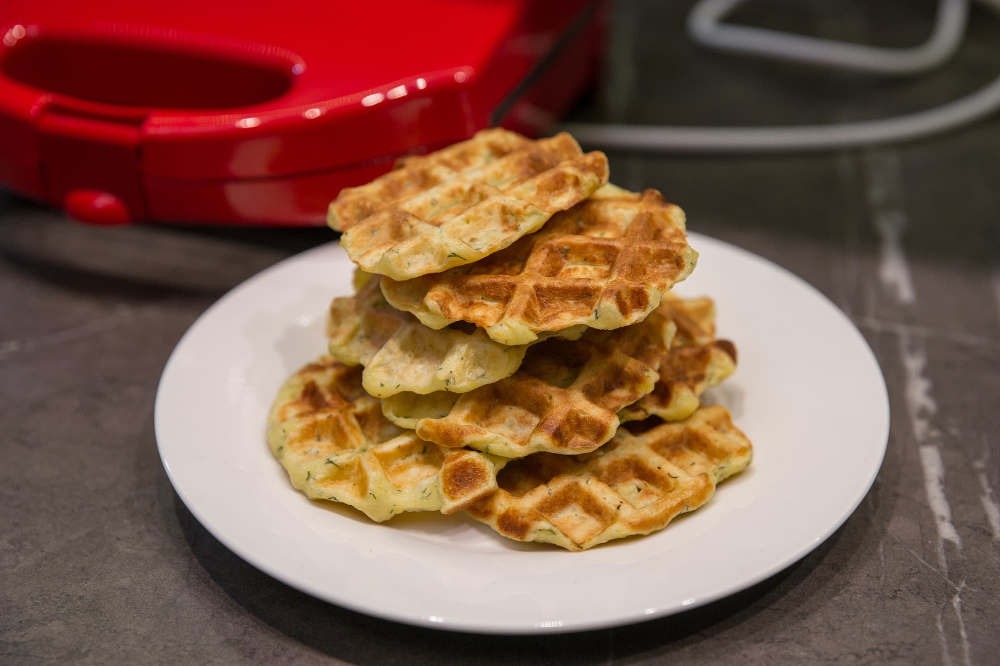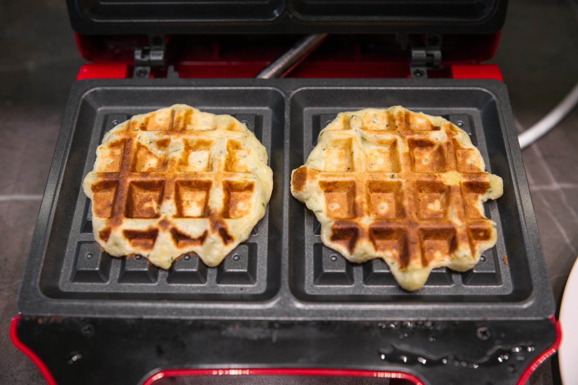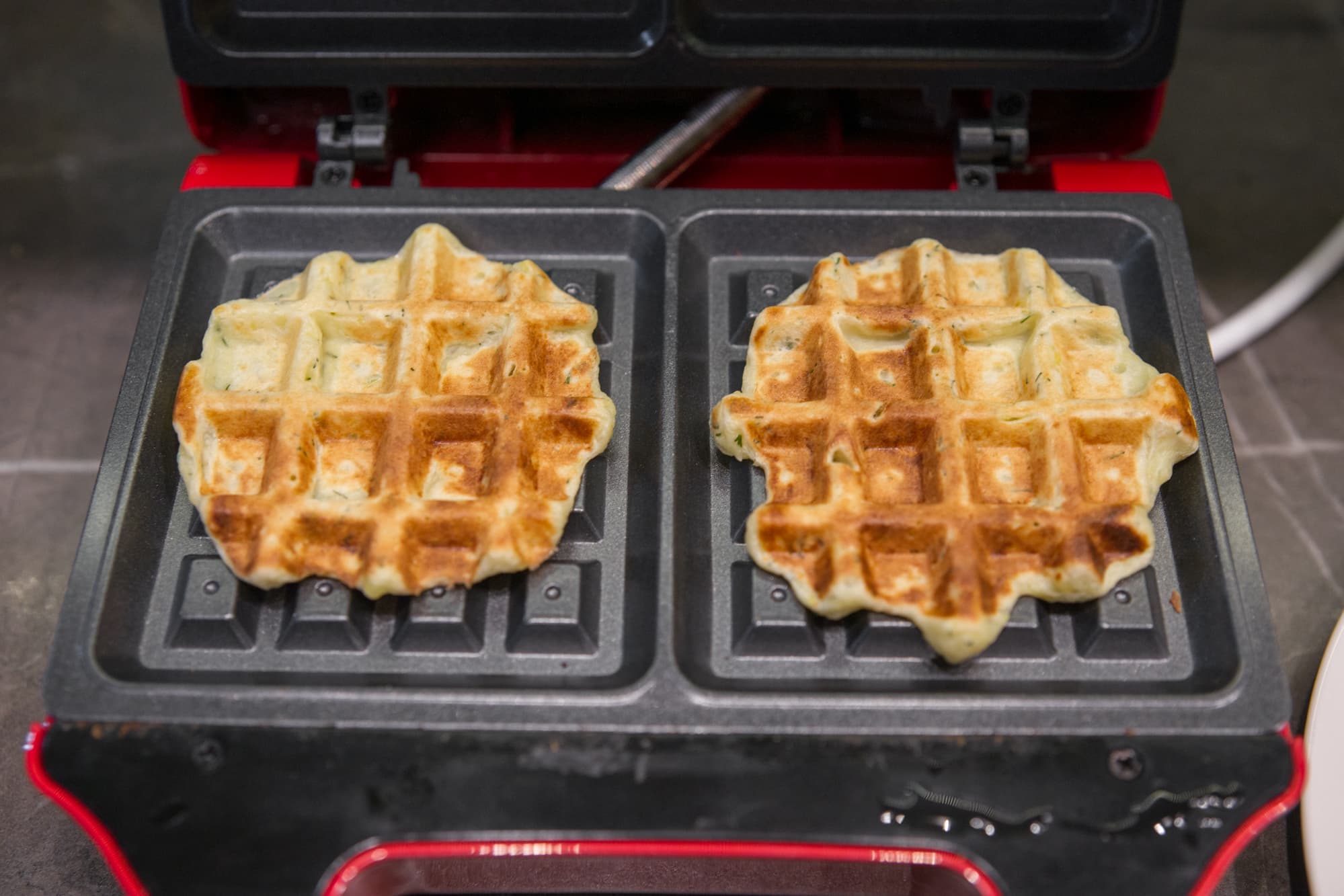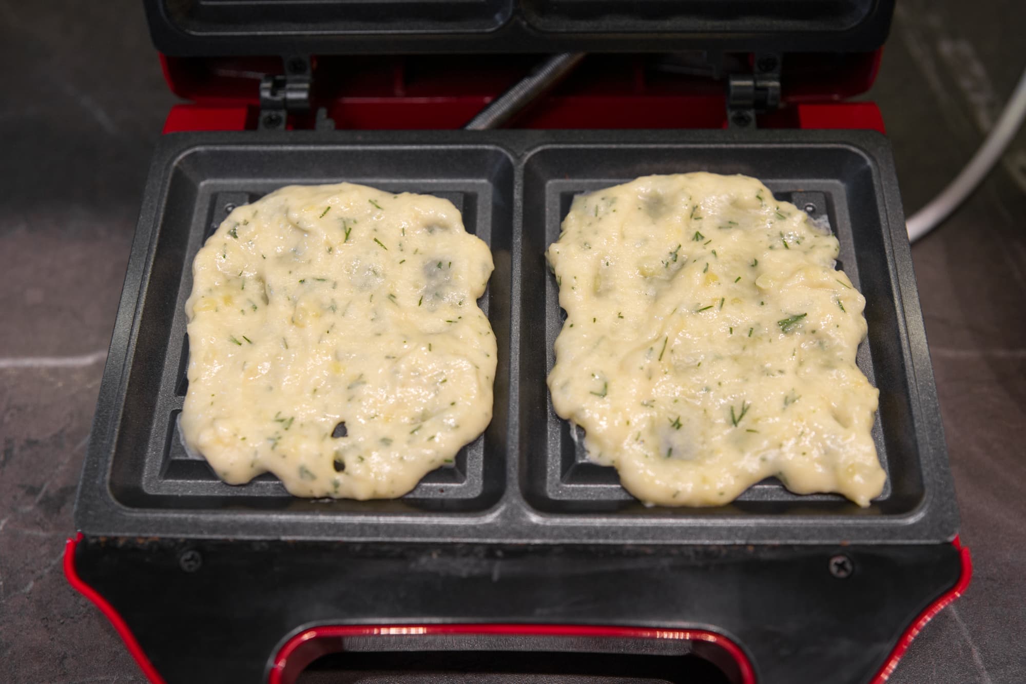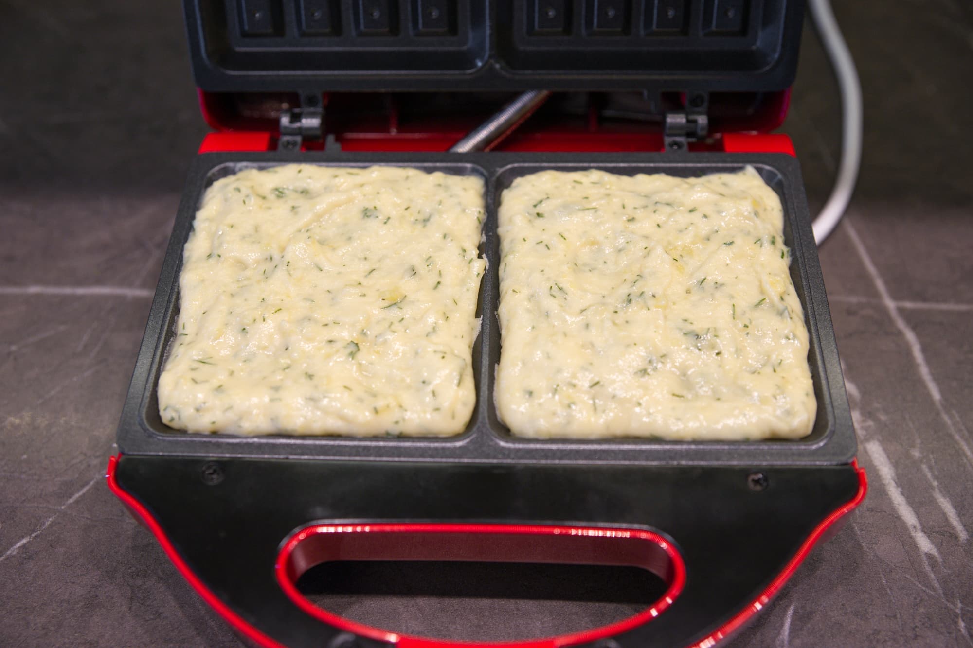 Заранее подготовленное картофельное пюре с молоком и сливочным маслом смешали с просеянной мукой, измельченным укропом, солью и парой яиц. Разогрели вафельницу в закрытом виде, выложили картофельную массу на панели, разровняли ложкой и закрыли вафельницу.