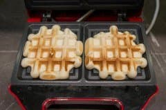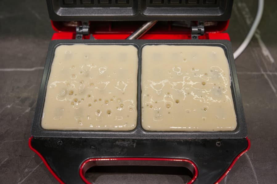 В зависимости от рецептуры и густоты теста, а также предпочтений в степени поджаривания корочки на одну порцию вафель может уходить от 5 до 12 минут. Толщина готовой вафли при максимальной заливке ячейки составляет 2,3-2,5 см.