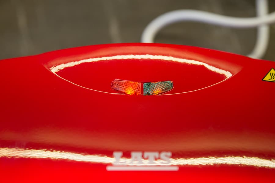 Корпус вафельницы Lats LT-109 покрыт ярко-красным глянцевым пластиком. Прибор выглядит аккуратно и довольно симпатично, хоть и простенько. Конструкция состоит из основания и верхней откидной части, соединенных между собой кабелем.