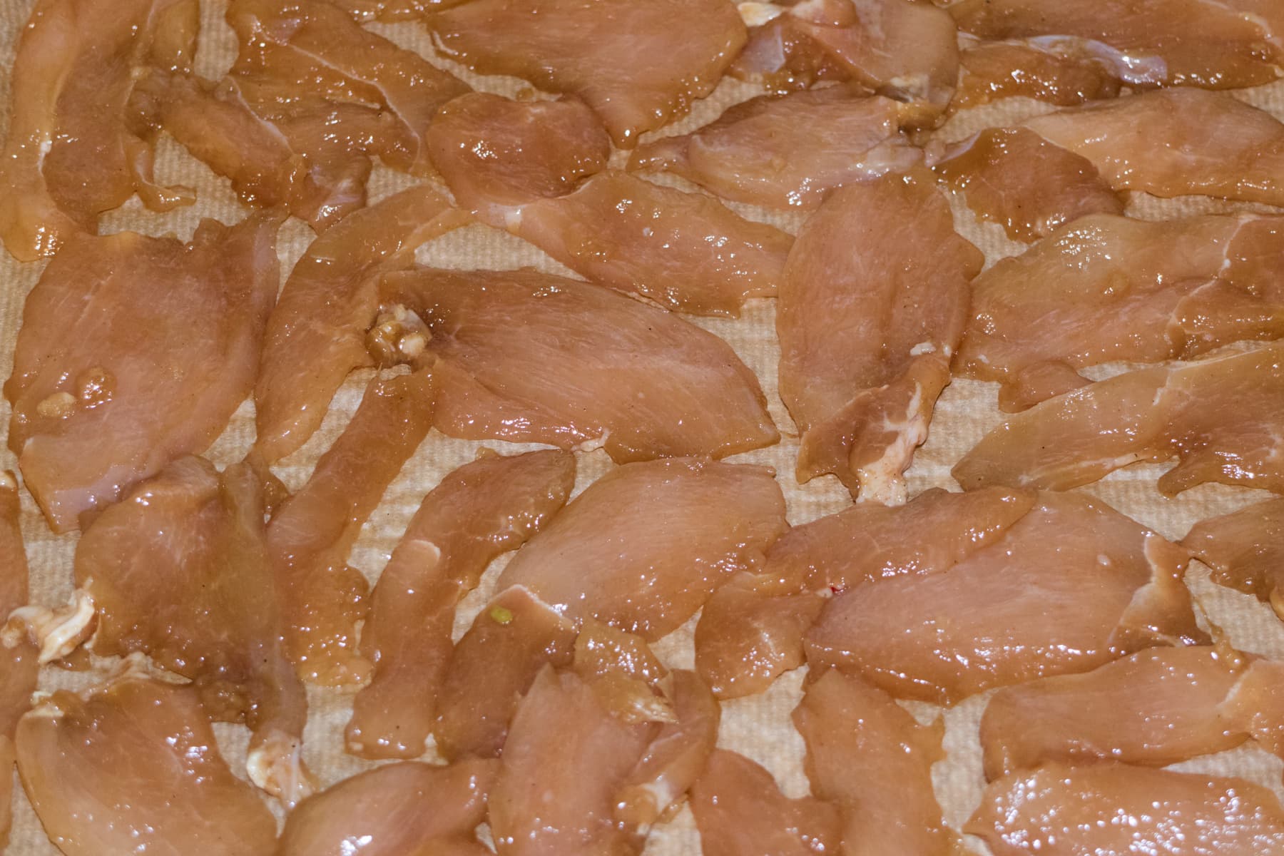 Для этого теста, ставшего уже традиционным, мы взяли килограмм очищенного от шкуры филе куриных грудок. Нарезали его на равные, по возможности, ломтики и замариновали в смеси соевого соуса с капелькой васаби, специй и давленого чеснока. Мариновали около полутора суток. Затем аккуратно, в один слой выложили на выстланные пергаментом решетки.