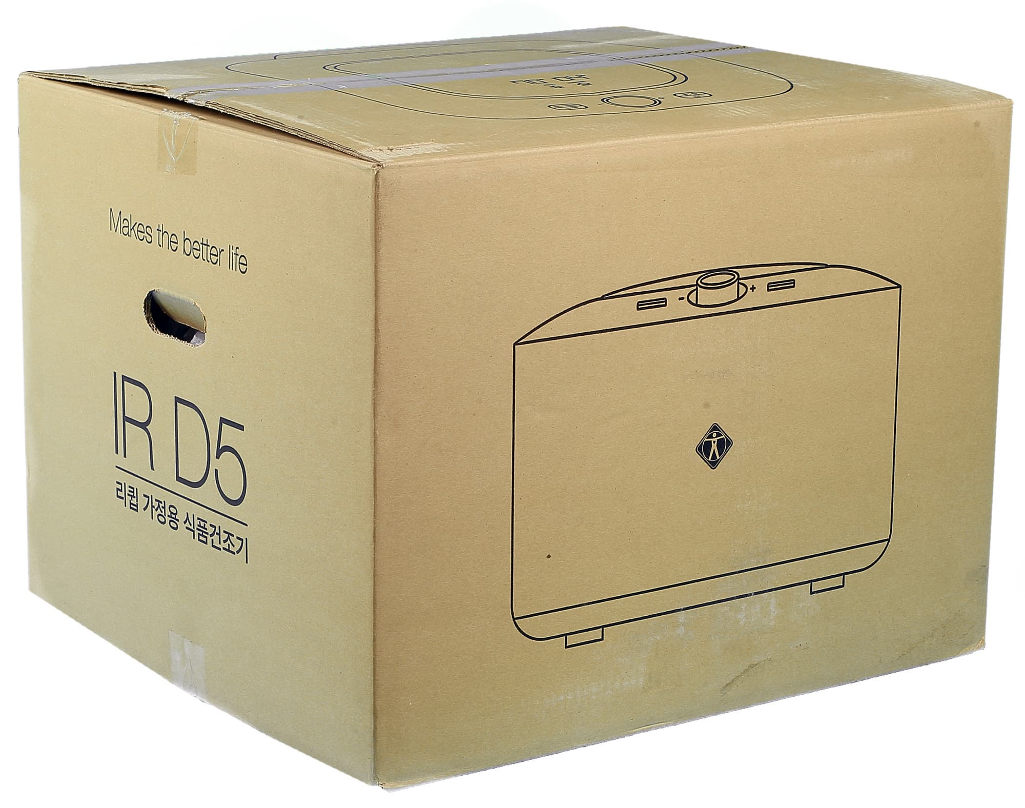 Простая коробка типичного светло-коричневого цвета как бы намекает нам, что производитель не тратит свое время и средства на ненужные маркетинговые уловки. Сверху и с боковой стороны мы видим схематическое изображение дегидратора в разных плоскостях. Смысл текстовой информации, к сожалению, нам недоступен, поскольку все сведения представлены на корейском языке. На одной из сторон была обнаружена небольшая наклейка с информацией о приборе, модели и кратких технических характеристиках на родном для нас языке. На боковых сторонах упаковки имеются выемки под ладонь, что облегчает транспортировку упакованного прибора.
