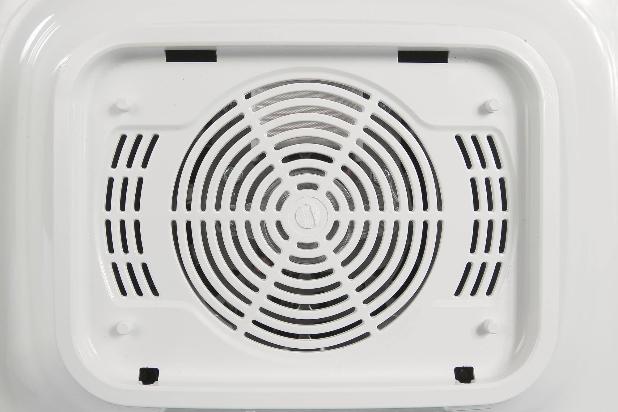 Поверхности внутренней камеры — белого цвета, вентилятор и кожухи тоже изготовлены из нержавеющей стали, хорошо отражающей тепло. Похоже, что об экономии электроэнергии корейцы знают не понаслышке. Сверху и снизу на боковых стенках видны отверстия для отвода воздуха. Расстояние между уровнями установки решеток составляет 3 см.