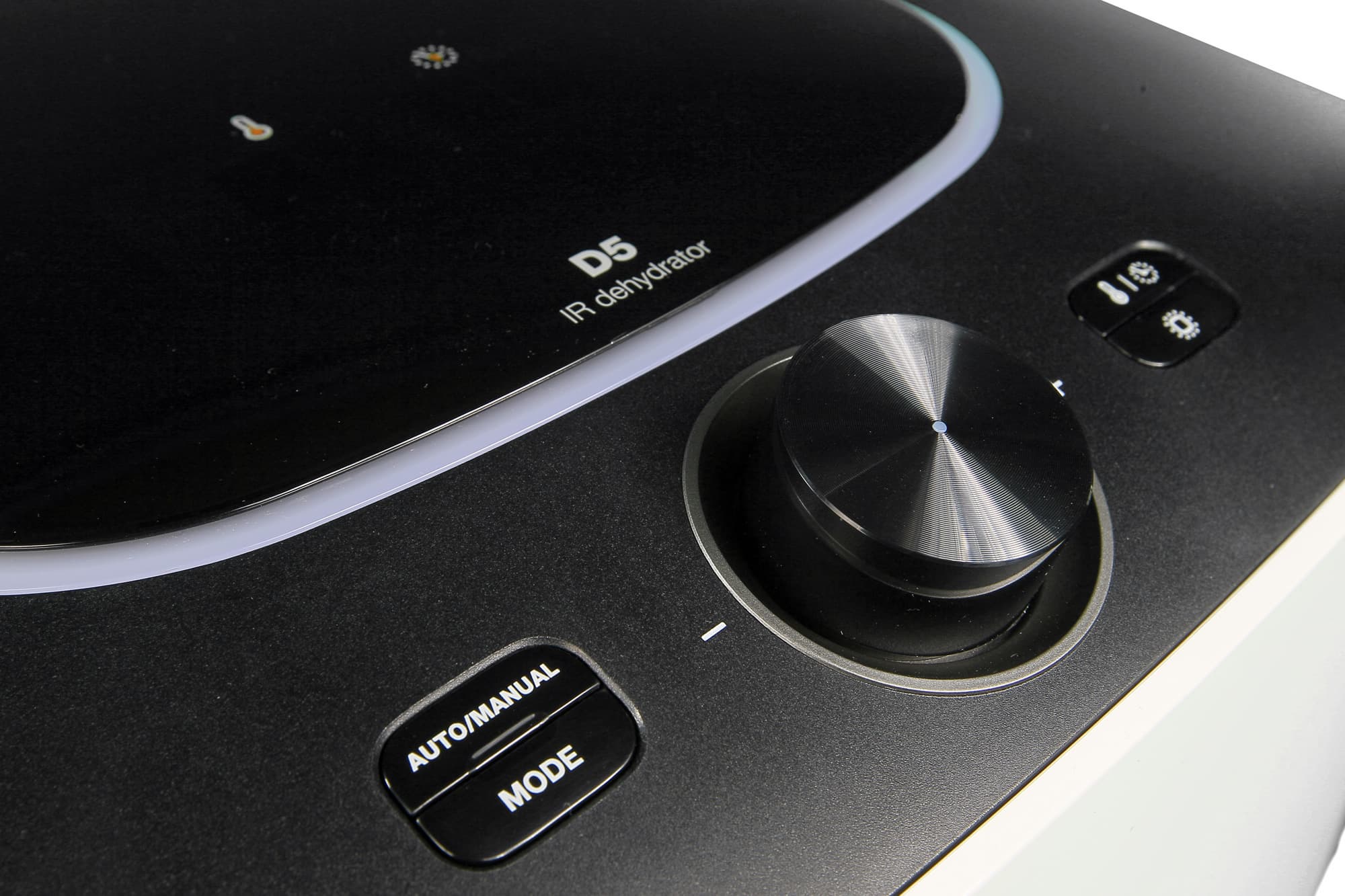 Ближе к пользователю на верхней стороне прибора расположена панель управления, представленная округлым регулятором, четырьмя кнопками и немного возвышающимся черным, зеркально отражающим табло. По периметру экрана имеется светло-серая вставка, под которой находится светодиодная подсветка, меняющая свой цвет в зависимости от выбранного режима работы дегидратора.