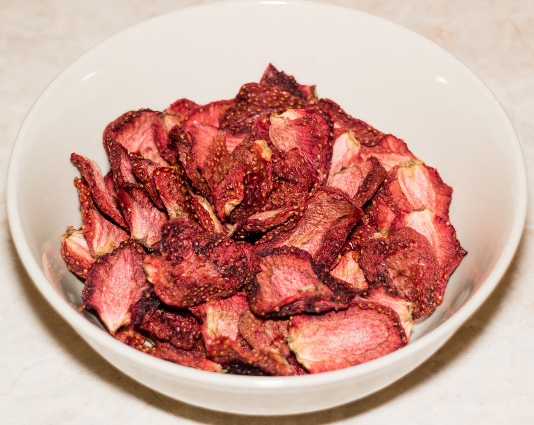 Сушилась ягода в автоматическом режиме «на солнце» 9 ч. 20 мин. За это время часть ягод хорошо высушилась до хрустящего состояния, однако крупные куски были мягкими внутри. Мы отобрали наиболее сырые, по нашему мнению, кусочки и отправили их на досушку: 2 часа на 60 °C. Дегидрирование 1,7 кг клубники до хрустящего состояния израсходовало 2,71 кВт·ч. Через неделю хранения в закрытом контейнере кусочки ягоды стали гибкими на изломе и более мягкими.