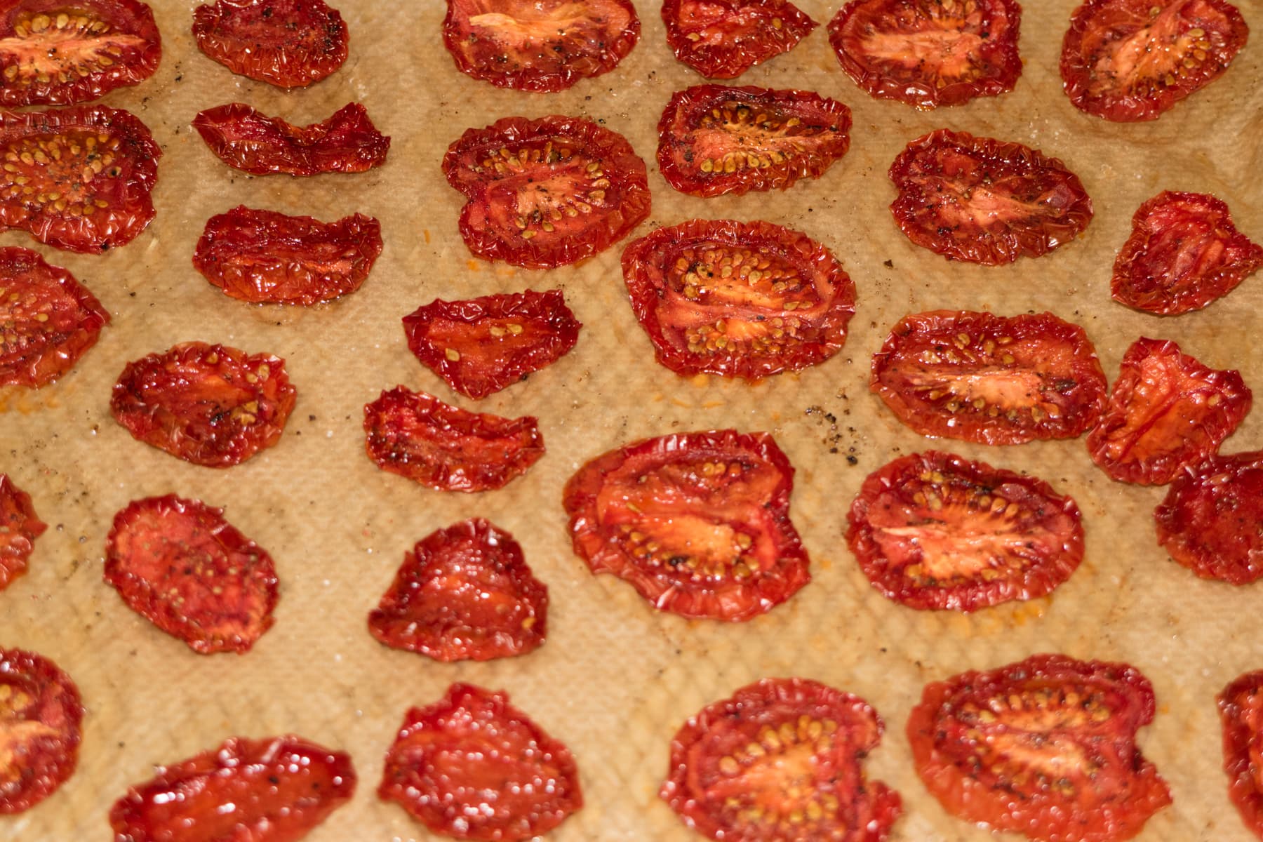 На один поддон у нас уместилось 864 г томатов, на другой — 862 г. Сушили в автоматическом режиме «на солнце». Процесс занял ровно 11 часов. Нам показалось, что томаты недостаточно суховаты, поэтому мы добавили еще 3 часа на 55 °C, однако это было нашей ошибкой: кусочки стали жесткими и пересушенными.