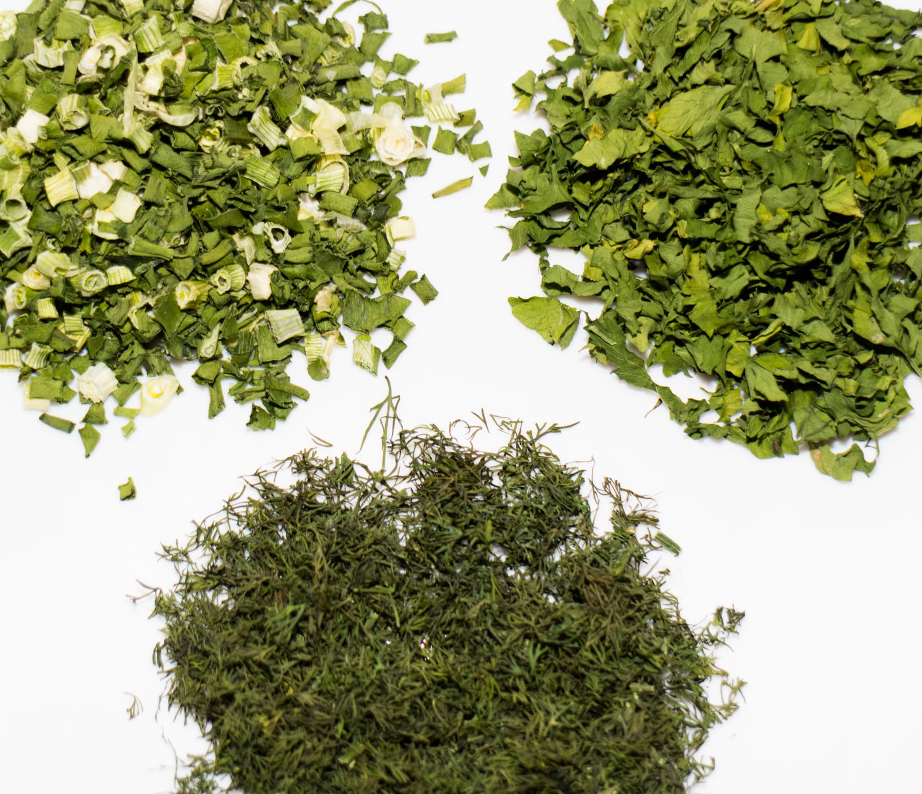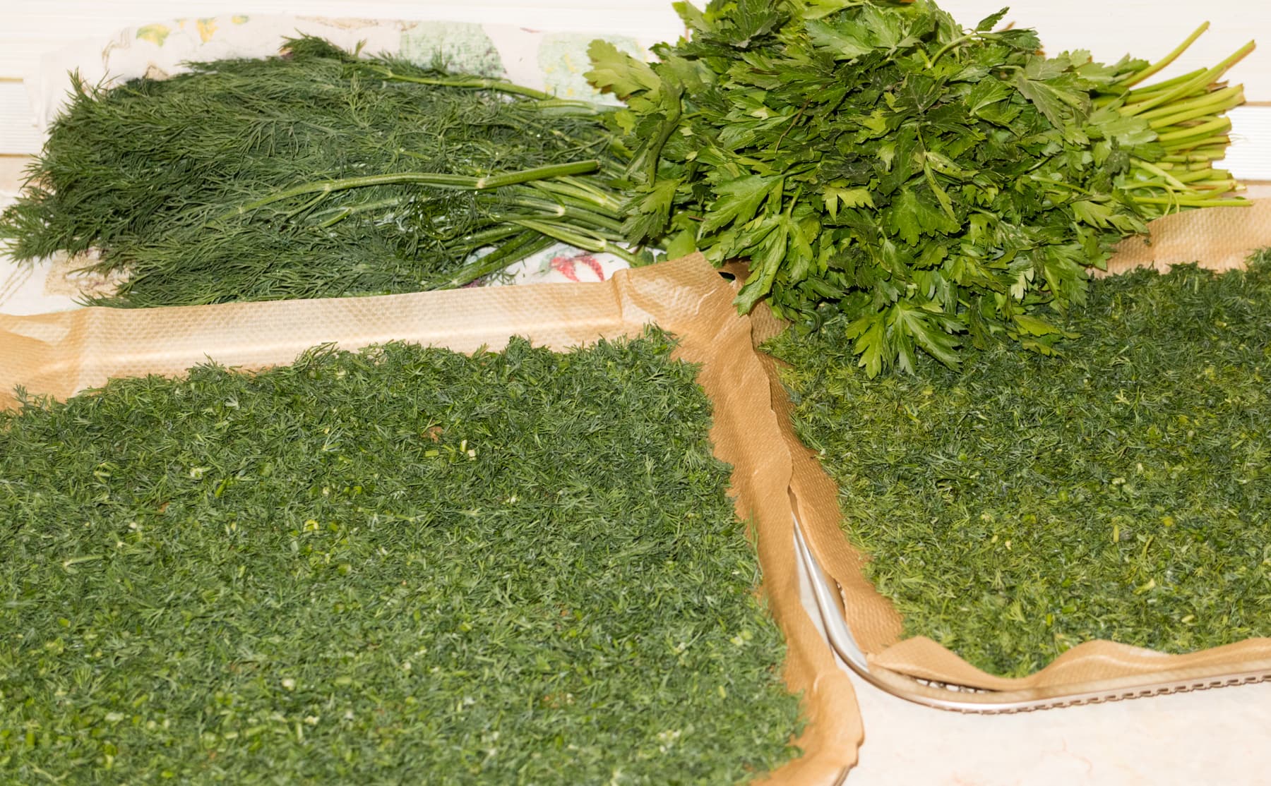 Режим «в тени» помог нам высушить 208 г петрушки (1 поддон), 145 г укропа (1 поддон) и 535 г лука (2 поддона). Сушка продолжалась 5 часов 15 минут, энергопотребление составило 1,53 кВт·ч. К степени просушки всех типов зелени замечаний нет. Ни визуально, ни на ощупь продукты, высушенные в разных режимах, не отличались: цвет яркий, запах интенсивный, укроп и петрушка при перетирании между пальцами крошатся, лук более жесткий и сохраняет свою форму.