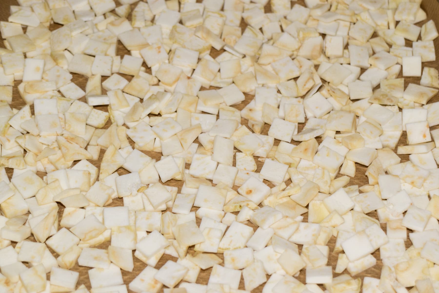Корневой сельдерей очистили и нарезали на более-менее ровные кусочки. Один корень разместился на двух лотках. Вес чистого продукта составил 750 г.