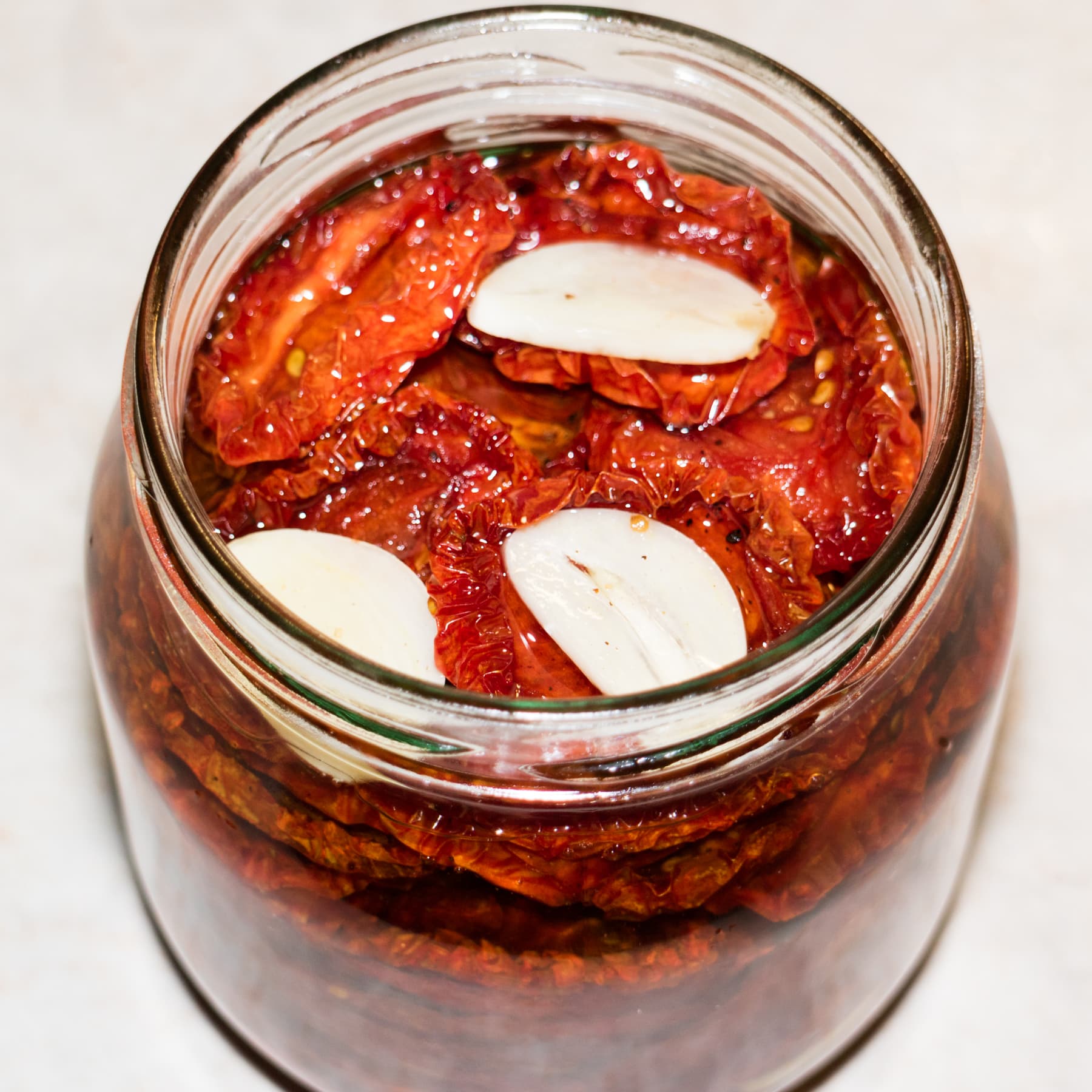 С ужасом заметив, что в тоске и размышлениях была сгрызена почти четверть высушенных томатов, остаток мы все же решили доготовить традиционным способом: сложить, смешав с чесноком, в баночку, залить помидоры оливковым маслом и попытаться забыть о них хотя бы на пару недель.