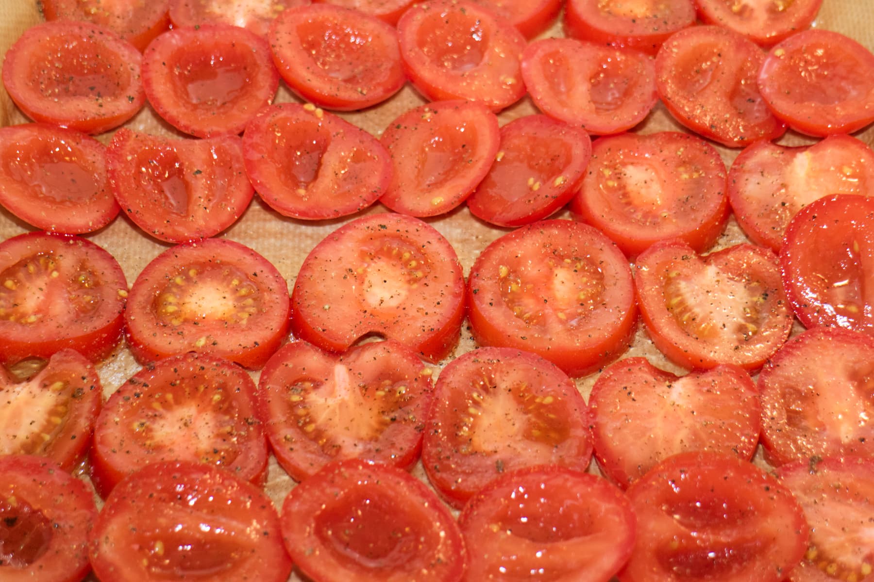 Томаты нарезали вдоль на четыре ломтика. Из крайних кусочков удалили излишки влаги. Разложили на решетках, посыпали сахаром, солью и свежемолотым черным перцем. Легонько прошлись по поверхности томатов кисточкой, смоченной в оливковом масле.