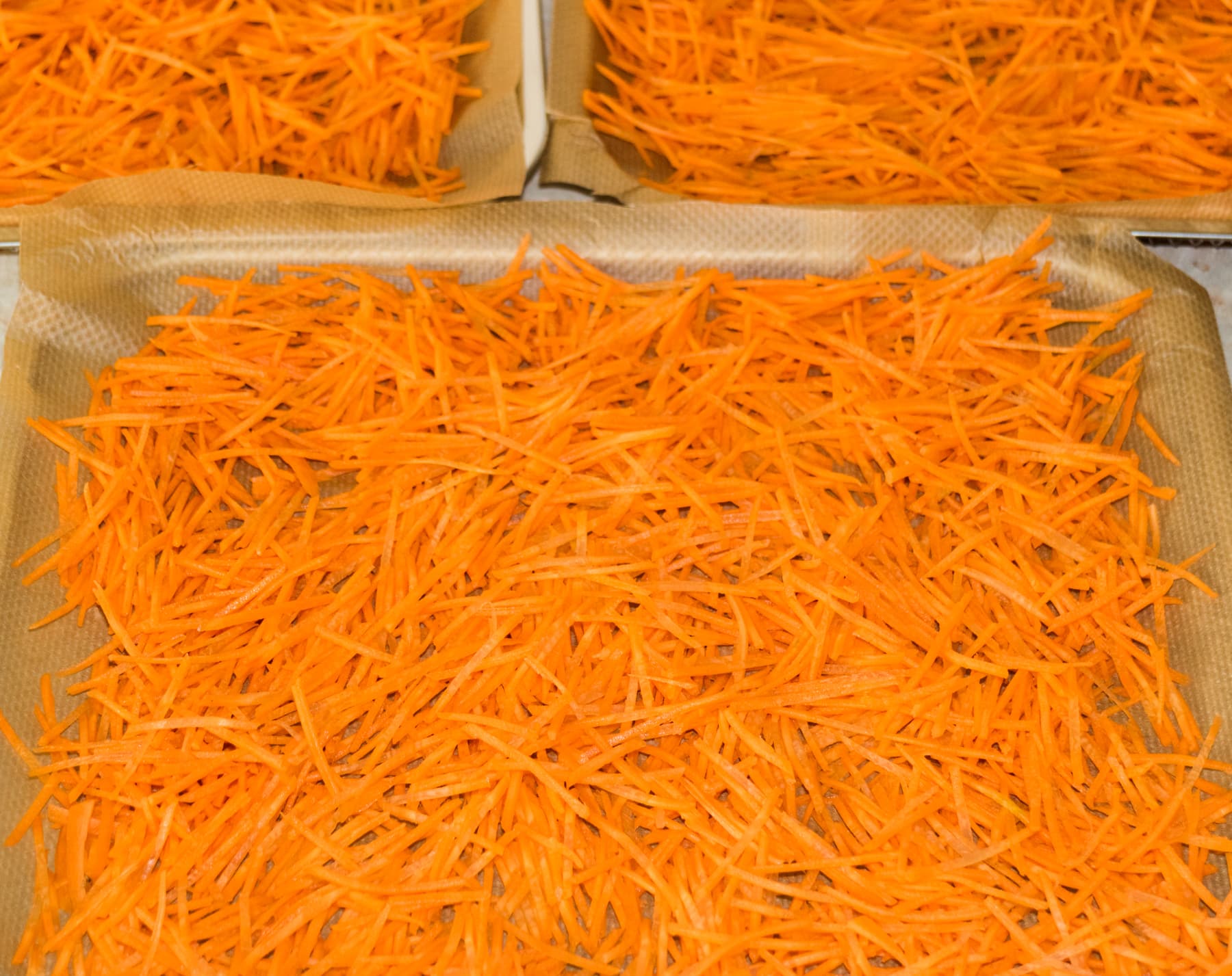 Очищенная и натертая морковь весом 1 кг была размещена на трех поддонах.