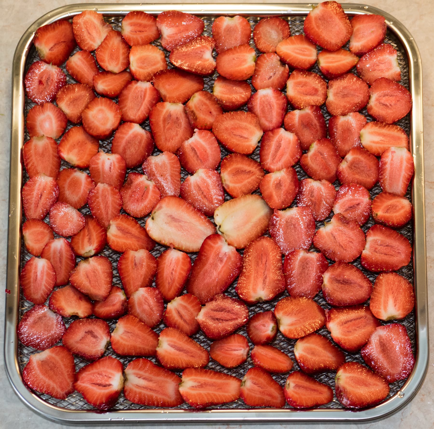 Следующим продуктом, подвергшимся высушиванию, была клубника. Ягоду промыли, удалили плодоножки и разрезали вдоль на две половинки. Всего в дегидраторе было размещено 1,7 кг подготовленной клубники.