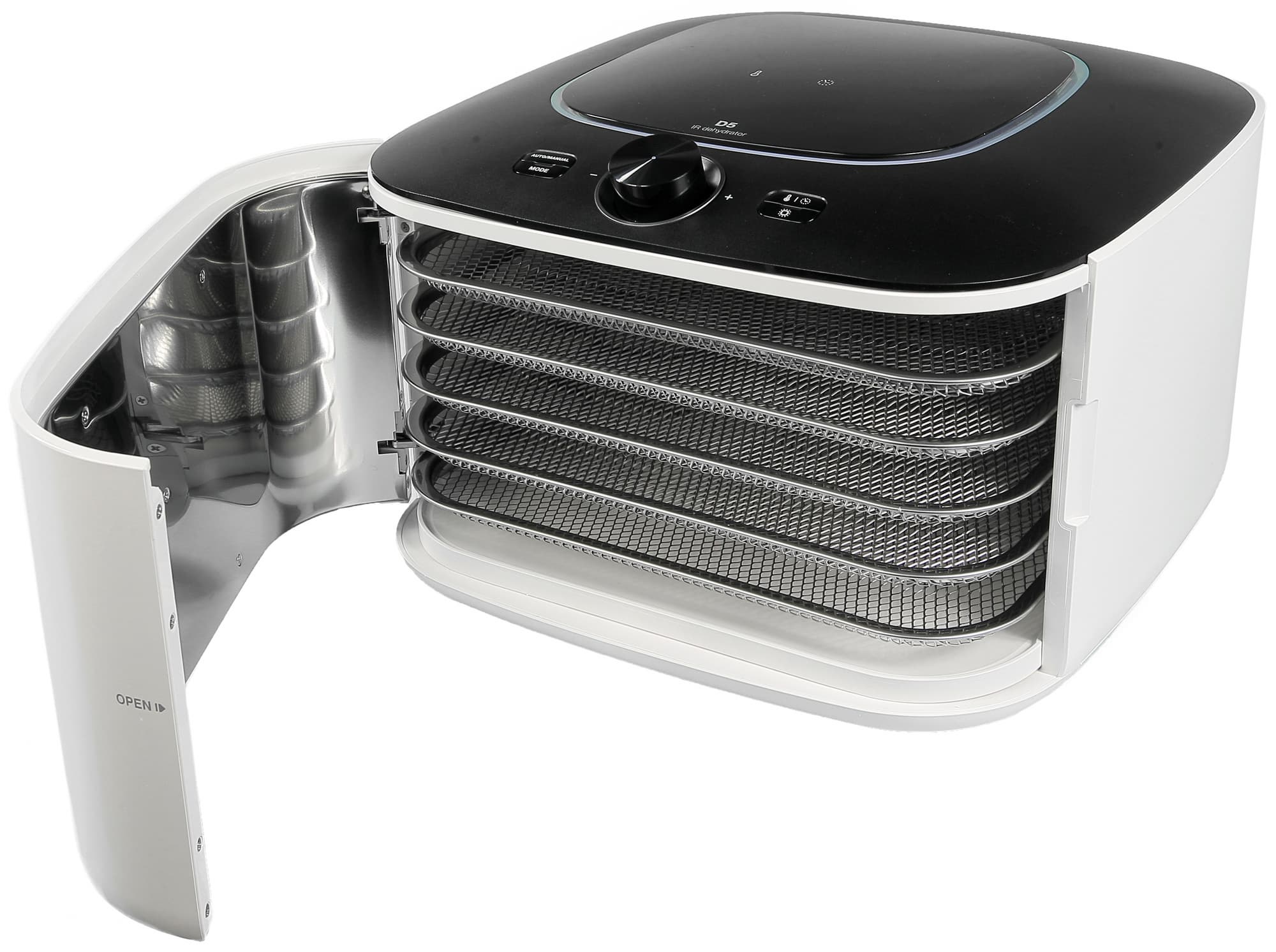 Дегидратор выглядит серьезным прибором, у него элегантный дизайн и простая конструкция, а разные мелочи, вроде фильтра для воздуха, отражающего тепло материала обшивки передней дверцы и инфракрасного излучателя, заставляют восхититься инженерной мыслью проектировщиков устройства. В ходе осмотра у нас возник один единственный вопрос: эффективно ли отводится влага от продуктов в камере с таким малым, на первый взгляд, количеством вентиляционных отверстий небольшого диаметра? Судя по продуманности устройства — наверное, да. Но доверие и очарованность — это не про нас. Поэтому ответить на этот вопрос мы сможем только после практических экспериментов.
