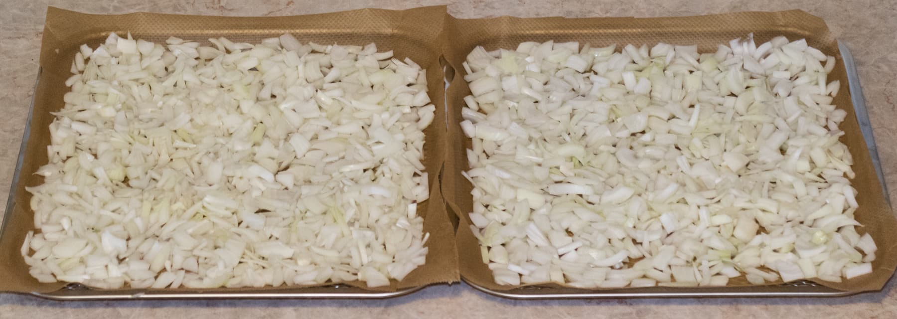 Предполагалось, что овощи будут нарезаны мелко, поэтому сначала мы вырезали из пергамента подходящие по размеру лотков листы. 1 кг очищенного и нарезанного лука разместился на двух решетках.