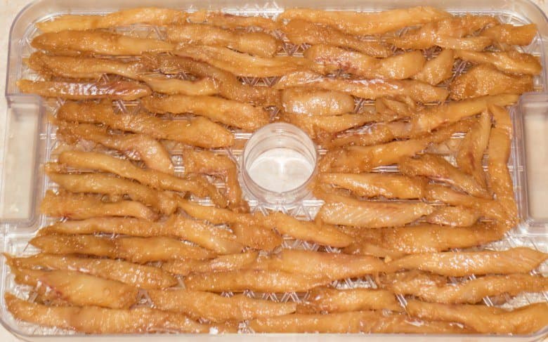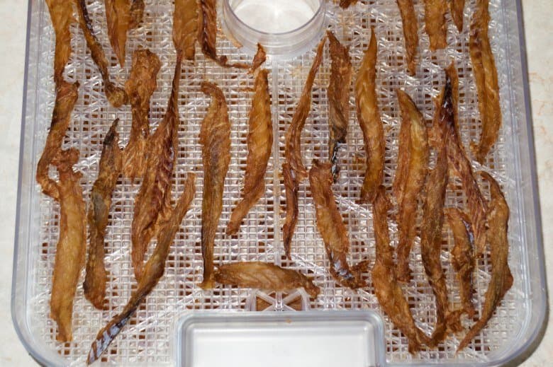 Дегидрация продолжалась 6 часов на 64 °C. В итоге рыба на обоих лотках отлично, даже чрезмерно, просушилась, кусочки ломкие, совершенно сухие, хрустящие. Визуально и на ощупь не удалось обнаружить более или менее пересушенных ломтиков. Так что равномерность сушки в данном опыте можно признать хорошей.