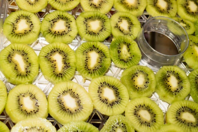 На следующем этапе эксперимента с фруктами была произведена сушка почти килограмма (940 г) киви. Очищенные и нарезанные на круглые ломтики киви были размещены на двух лотках.
