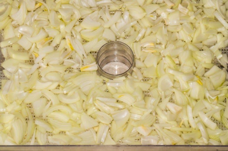 Установили поддоны с овощами на основание дегидратора в следующем порядке: лук, лук, болгарский перец, морковь, лук. Таким образом, сравнив состояние лука на лотках у основания и сверху, мы сможем проследить, одинакова ли сушка на разных уровнях от вентилятора.