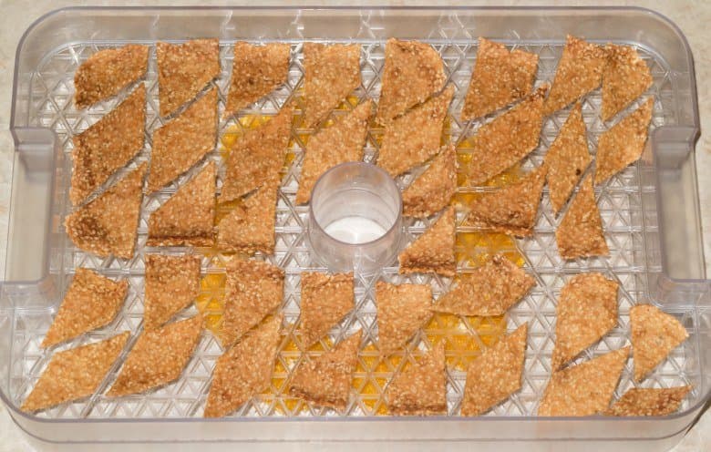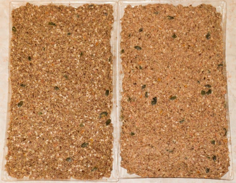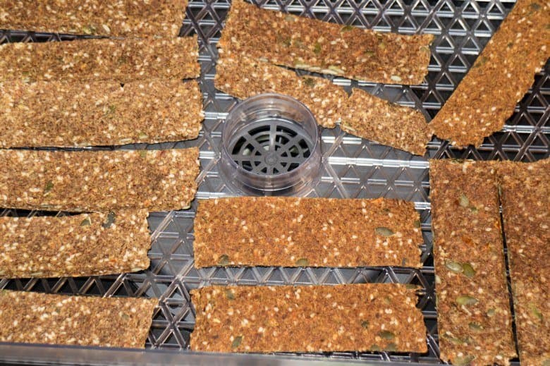 Сушили пять часов на 45 °C. Затем извлекли будущие хлебцы из форм, нарезали их на длинные прямоугольные кусочки и положили досушиваться на лотки.