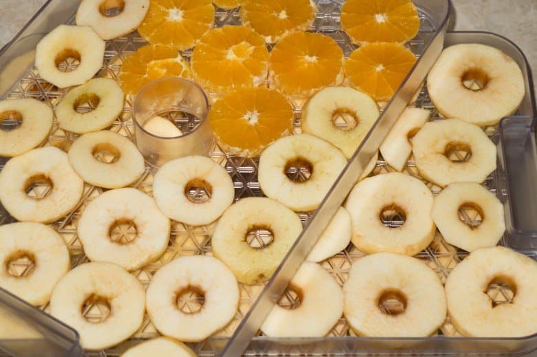 Яблоки очистили, вырезали сердцевину, нарезали на ровные круглые ломтики. На одном лотке поместилось в среднем 550 г фруктов. В один поддон доложили два апельсина. Апельсины почистили и нарезали поперек долек на круглые кусочки.