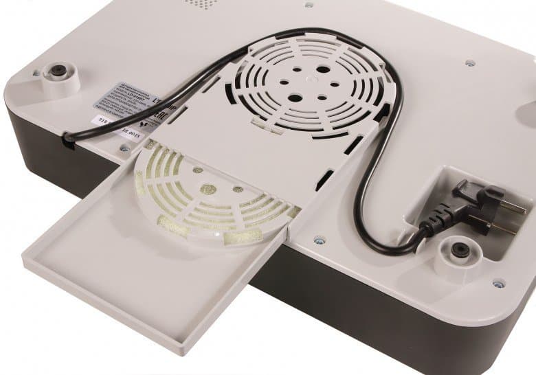 Со стороны дна прибор оснащен четырьмя ножками. Высота ножек около полутора сантиметров. Каждая из ножек оснащена противоскользящей резиновой накладкой. По центру дна можно увидеть отверстия воздухозаборника с фильтром. С задней стороны основания находится выдвижная деталь, внутри которой установлен сам фильтр. Если потянуть за ручку, то выдвинется панель, в центре которой размещается тонкая вкладка из пористого материала. Панель выдвигается довольно туго, вставляется так же туго со специфическим щелчком.