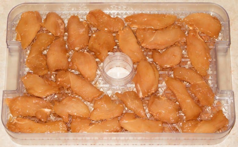 900 г филе куриной грудки нарезали на ровные кусочки толщиной не более 7 мм. Замариновали в смеси соевого соуса, терияки и шрирачи на ночь. На один поддон поместилось 480 г курицы. Значит, за один раз в дегидраторе можно завялить около трех килограммов.