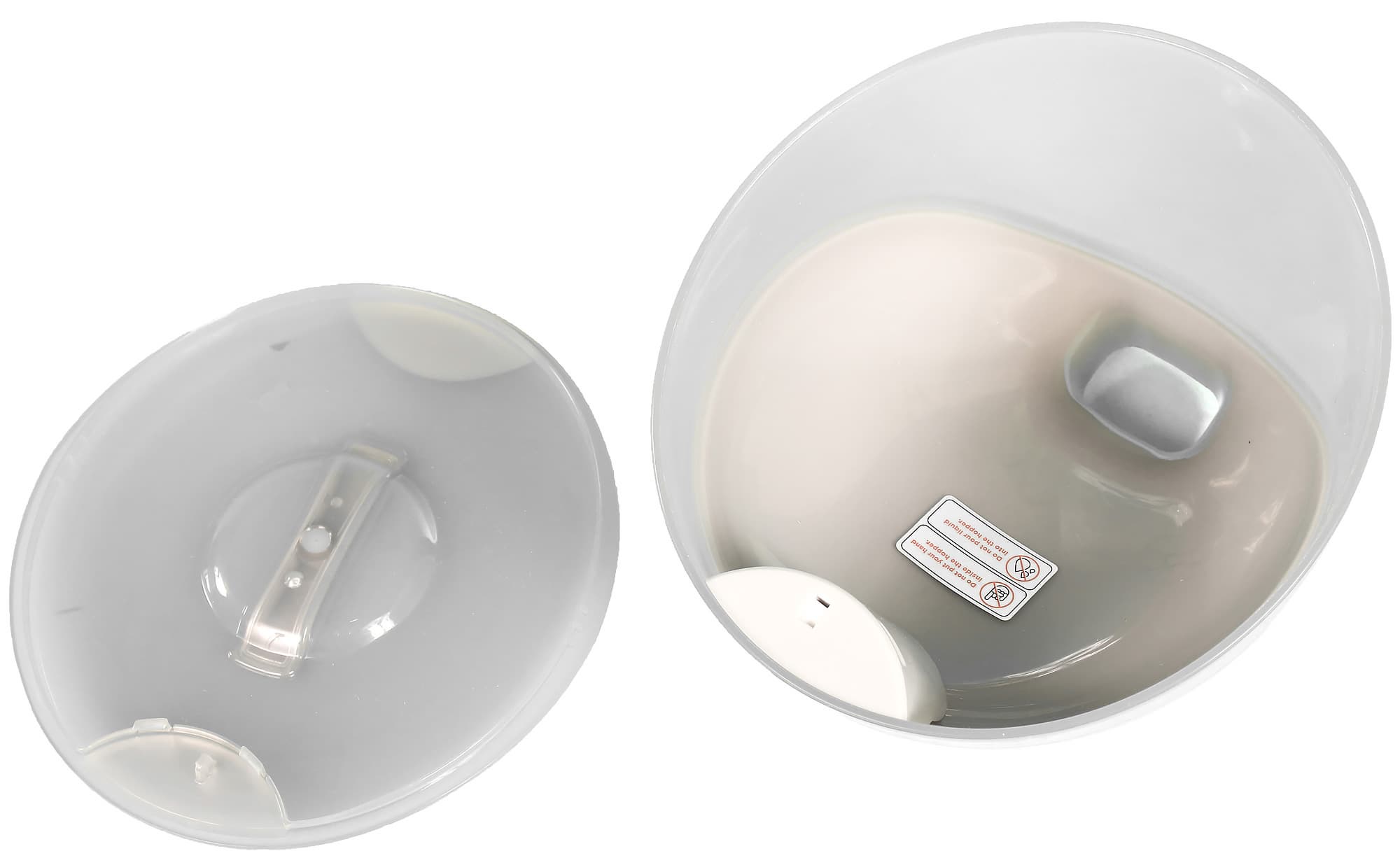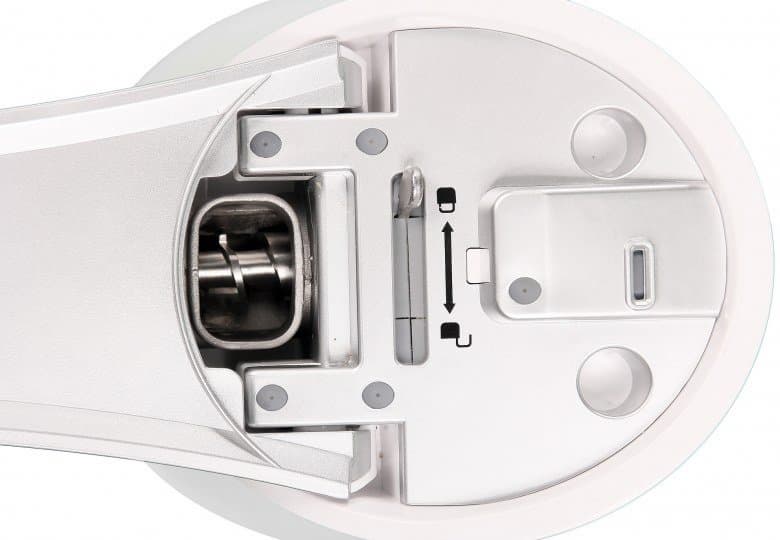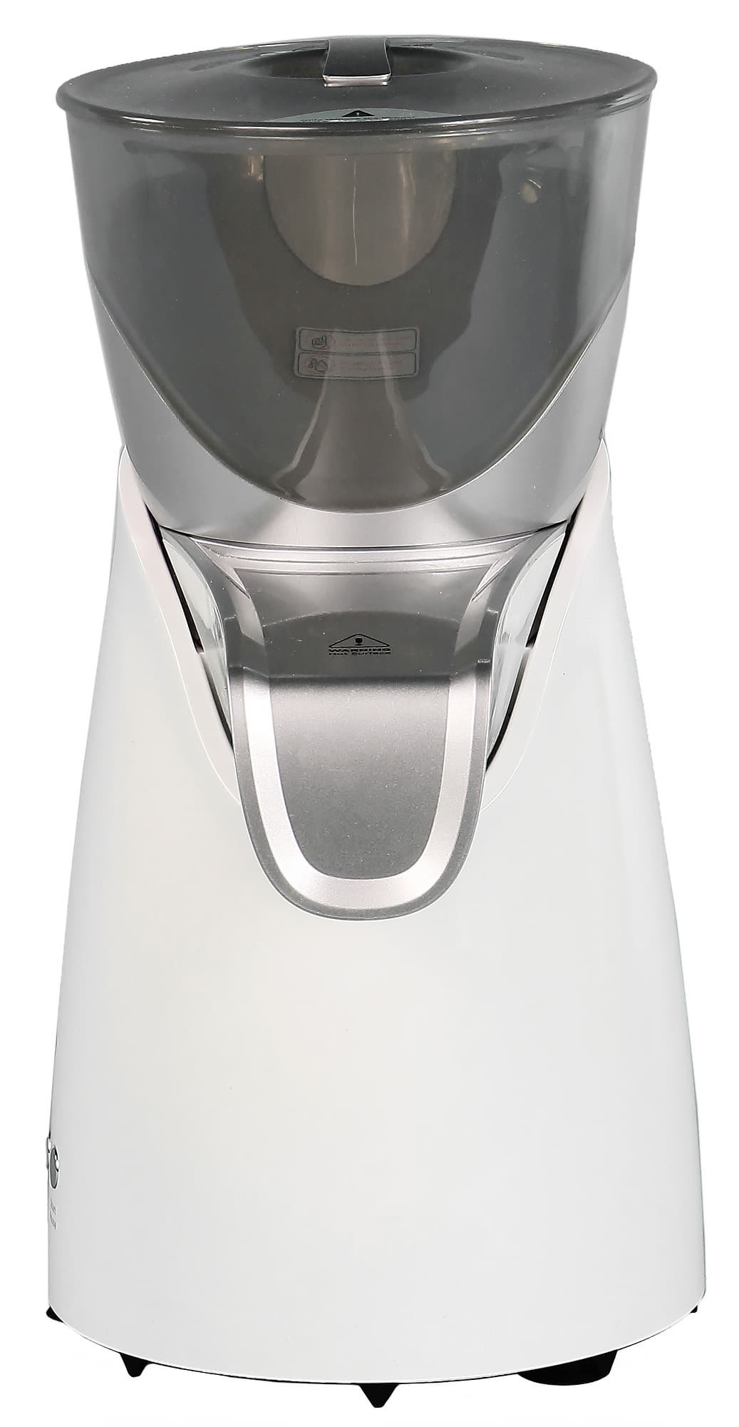 Первая мысль, возникающая при взгляде на маслопресс, связана с его габаритами. Прибор оказался неожиданно лаконичным и относительно небольшим. Корпус двигателя белого цвета имеет цилиндрическую форму, слегка сужающуюся кверху. Выдающийся вперед носик — это защитная крышка отжимной корзины. Сверху на корпус двигателя установлена загрузочная камера.