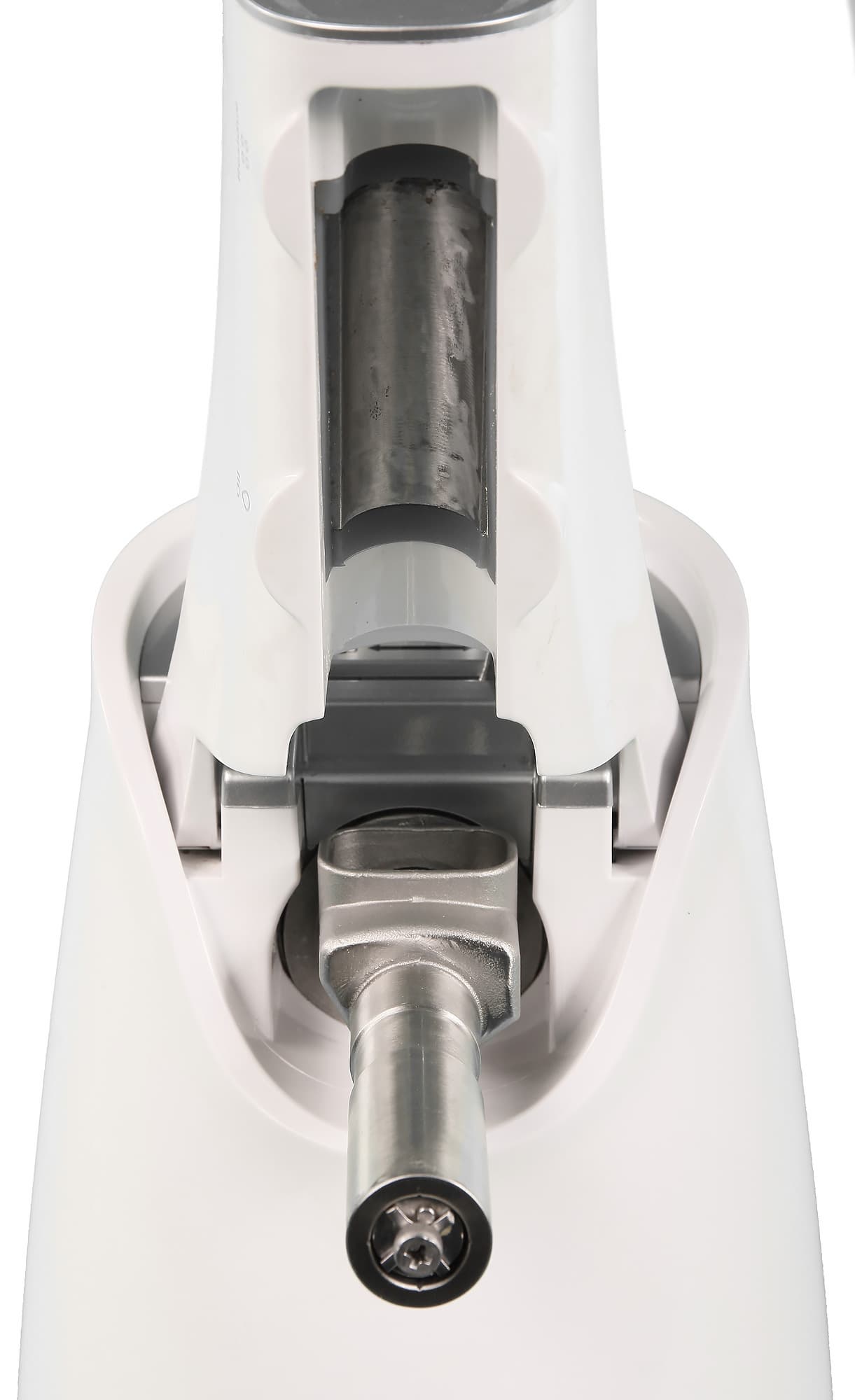 Описывая аппарат, параллельно можно рассказать об этапах сборки. Сначала следует поднять защитную крышку шнека, затем перевести рычаг фиксации в открытое положение и вставить шнек. Шнек изготовлен из нержавеющей стали, длина его рабочей части около 14 см. Высота витков постепенно уменьшается по длине шнека. Вырезы, имеющиеся в начальной части, позволяют отжимать масло из довольно крупных семян и орехов.